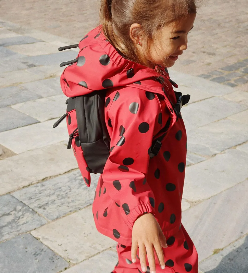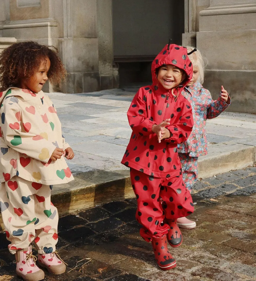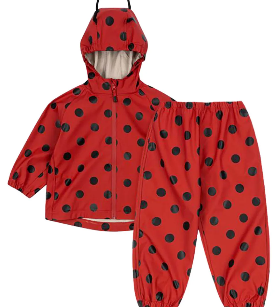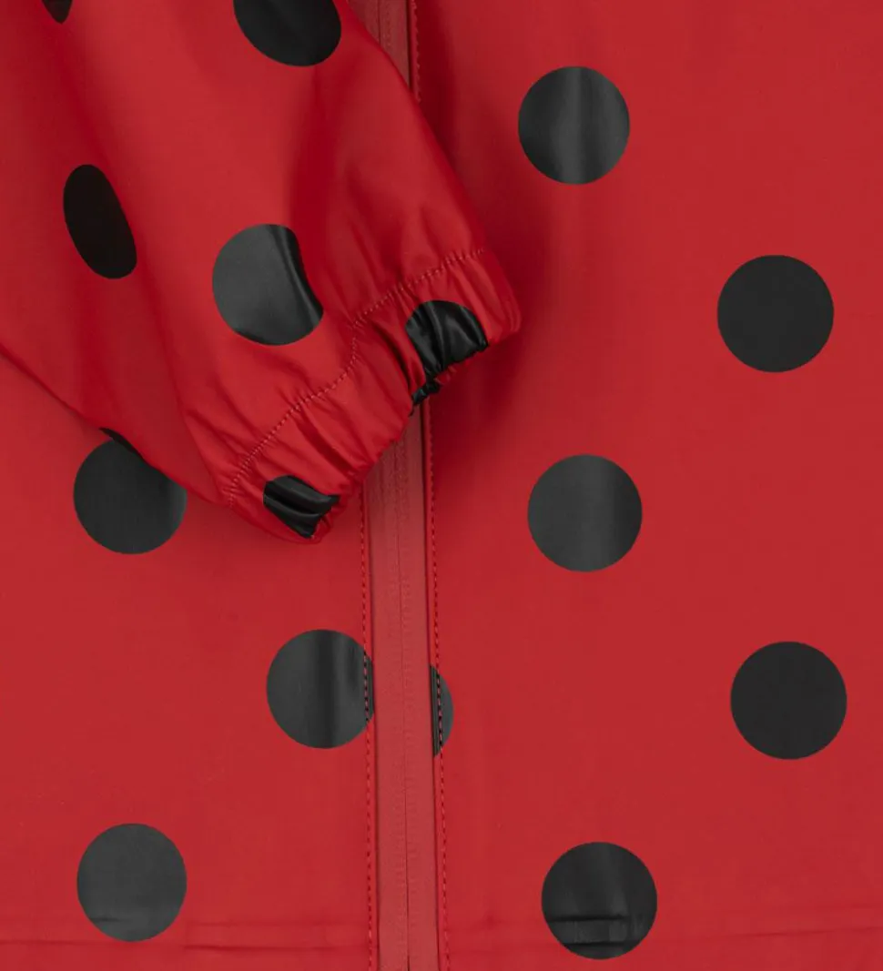 Lækkert Konges Sløjd regntøj i rød med store, sorte prikker.