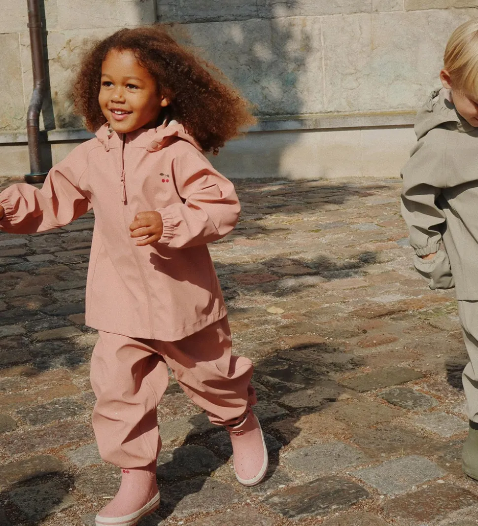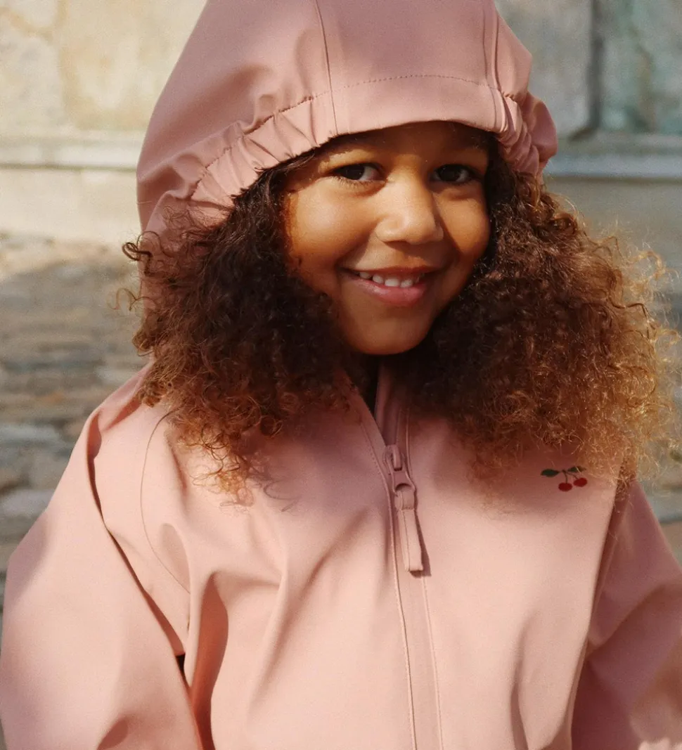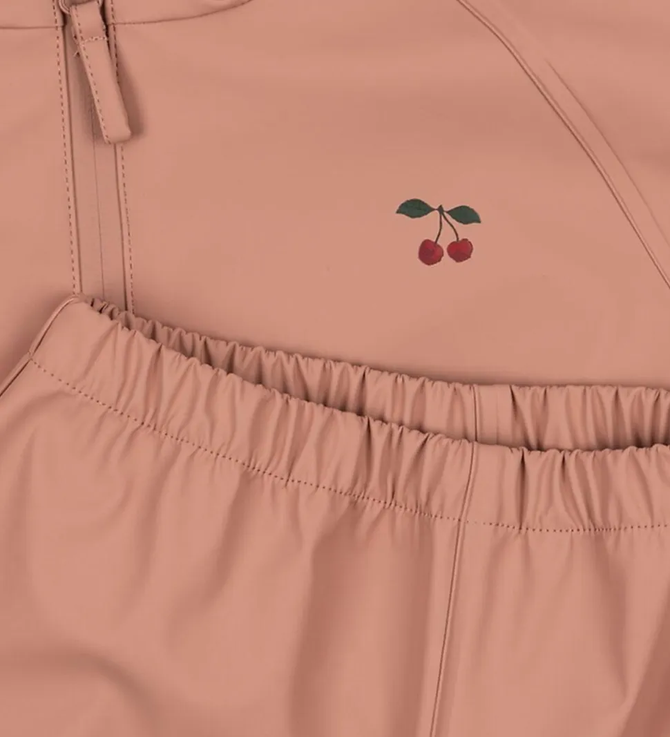 Lækkert Konges Sløjd regntøj i mørkerosa med et lille kirsebærprint på venstre bryst.