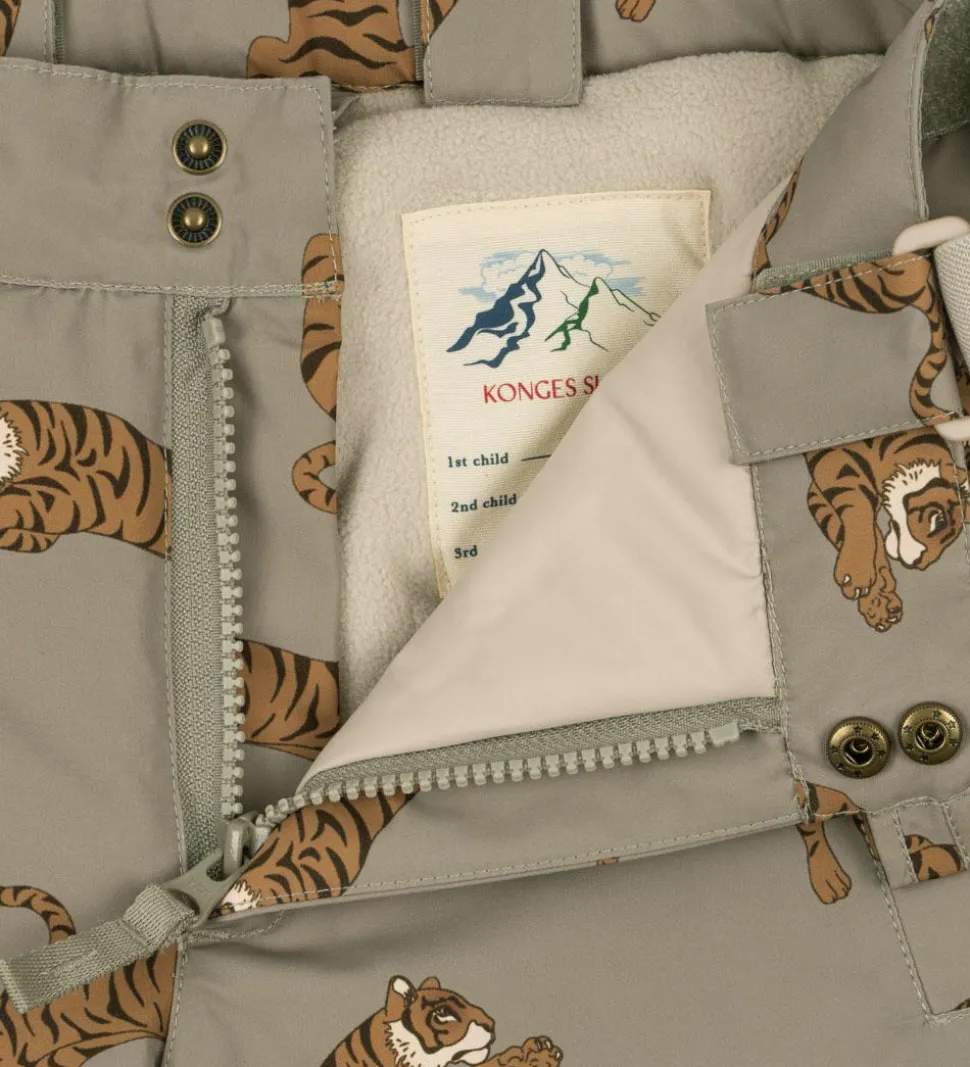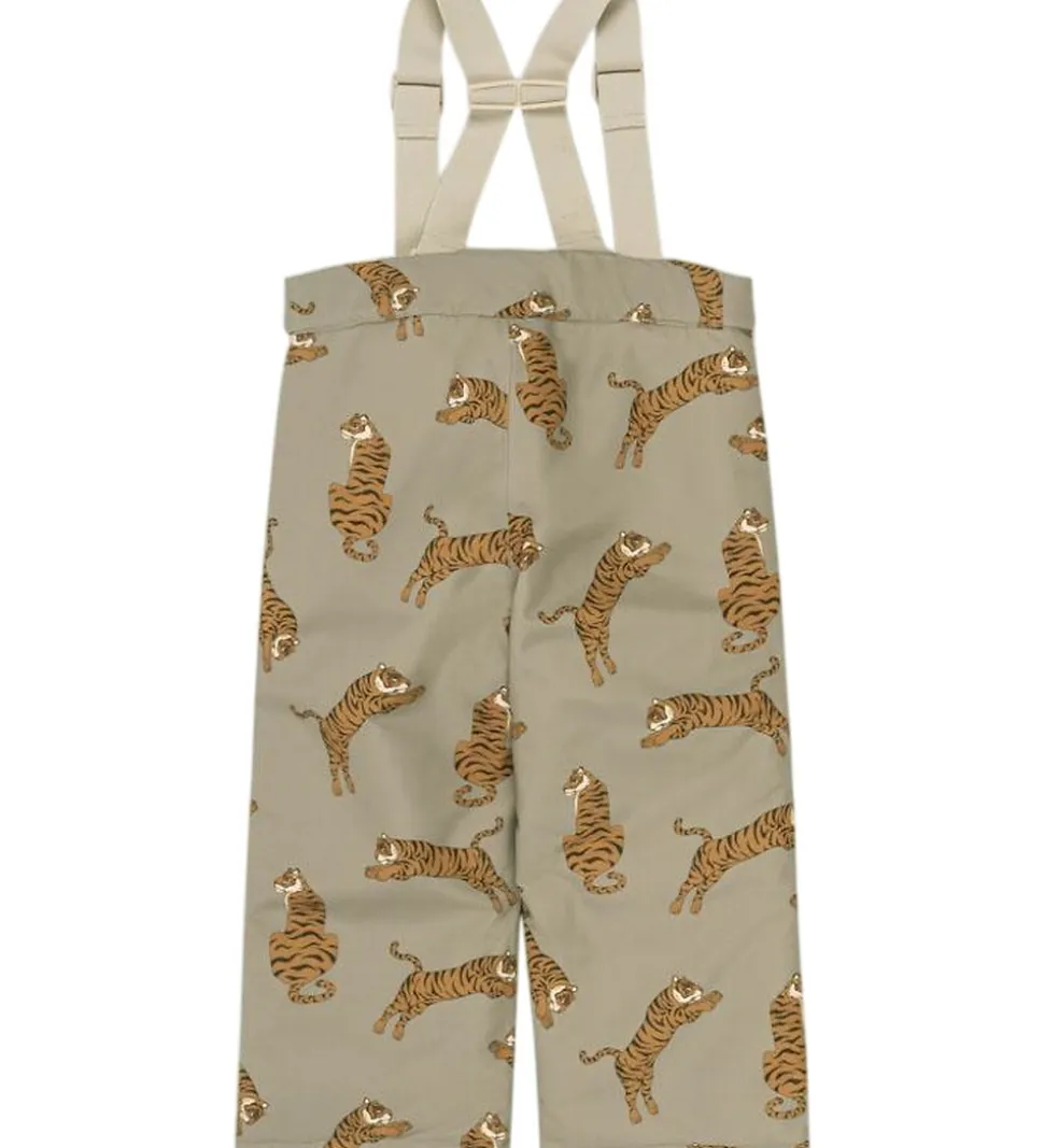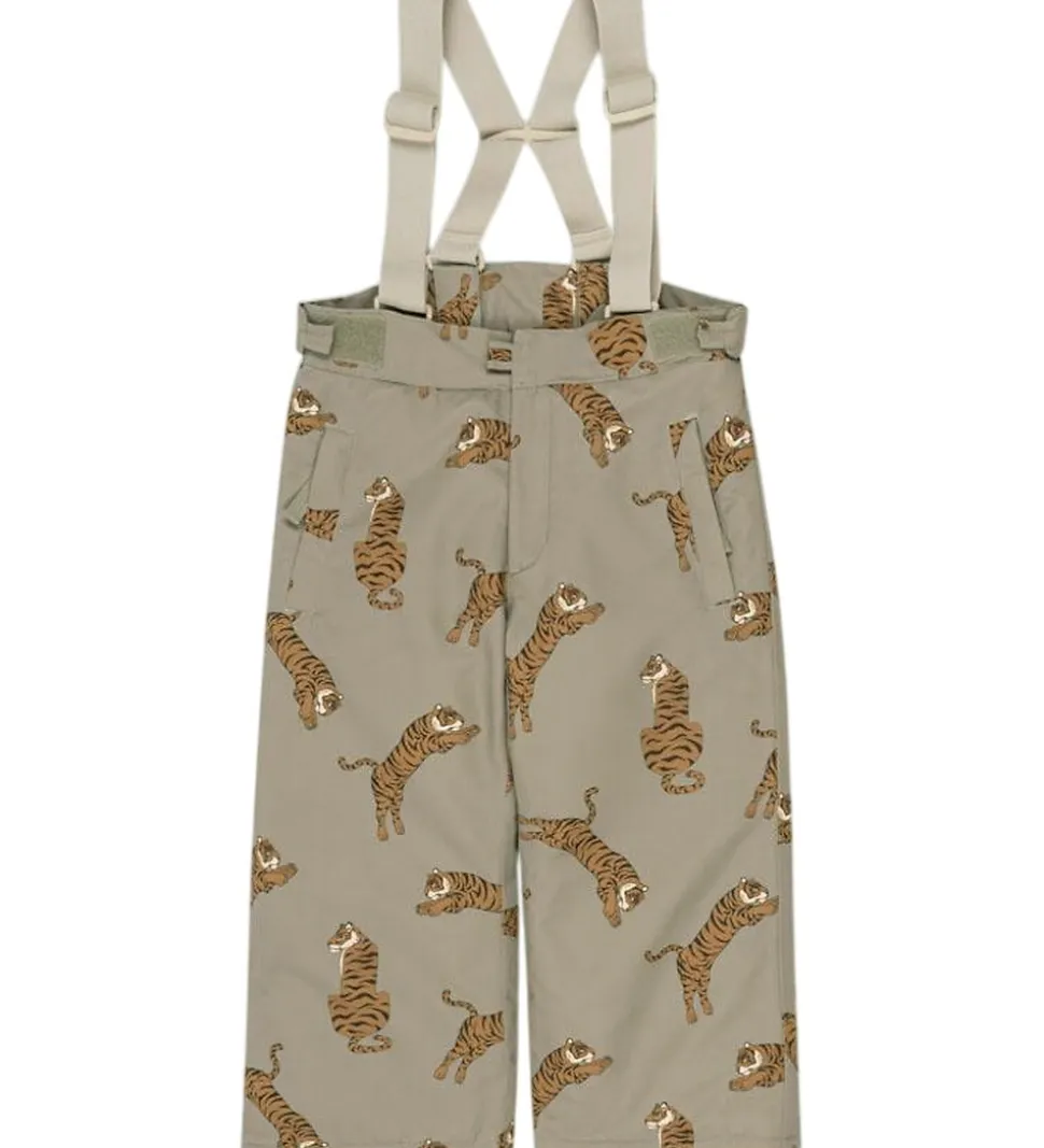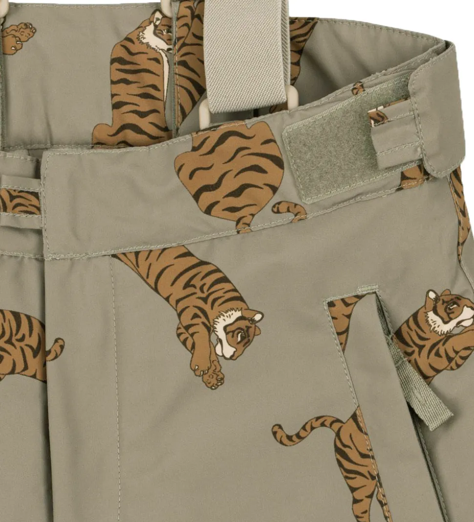 Praktiske Konges Sløjd skibukser i en støvet grøn og med et alloverprint af tigere i brune nuancer.