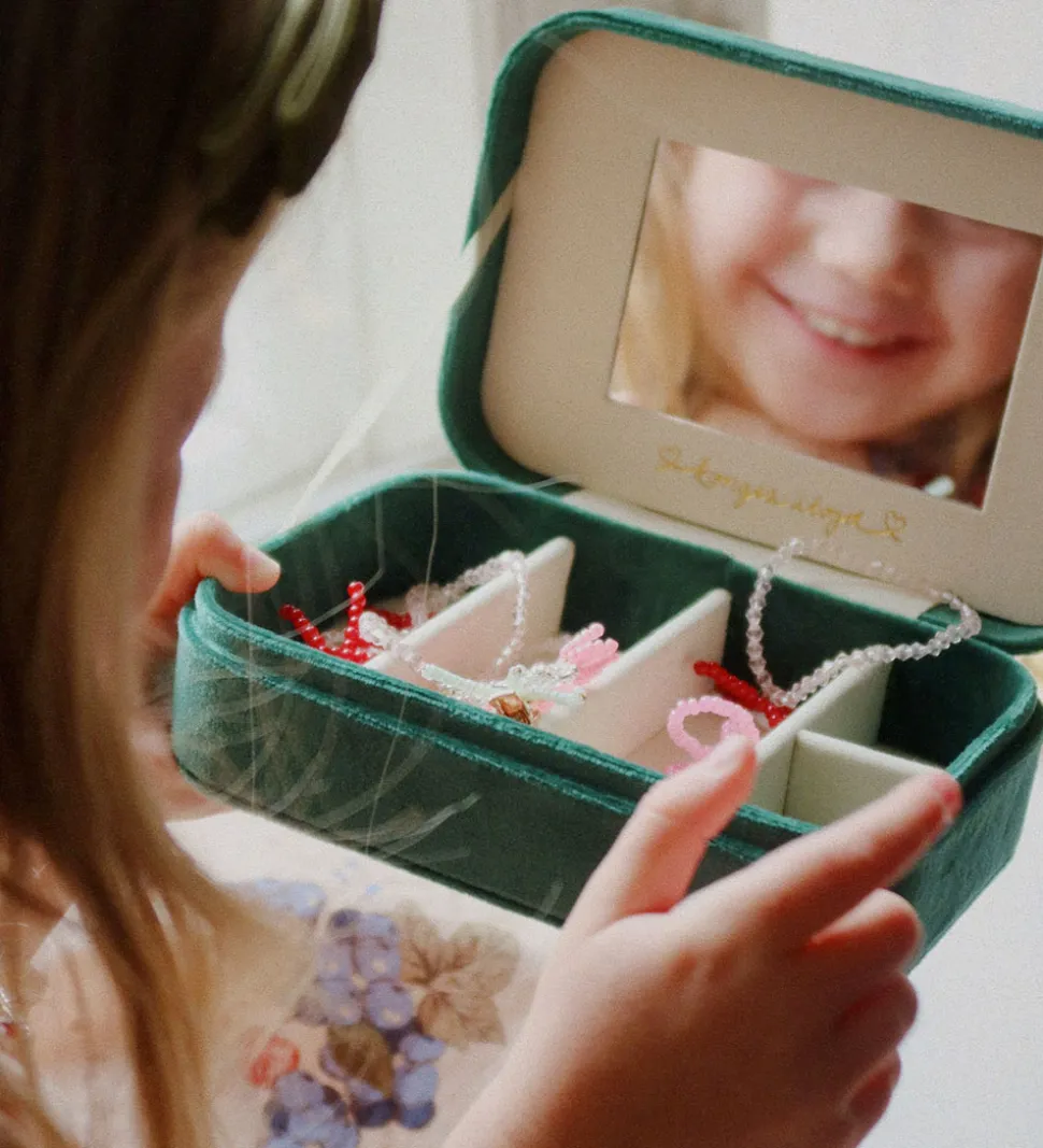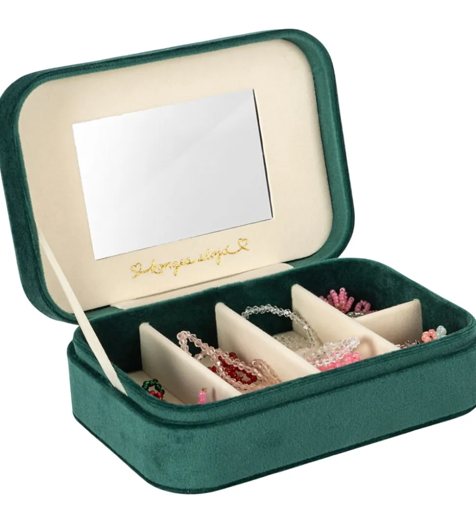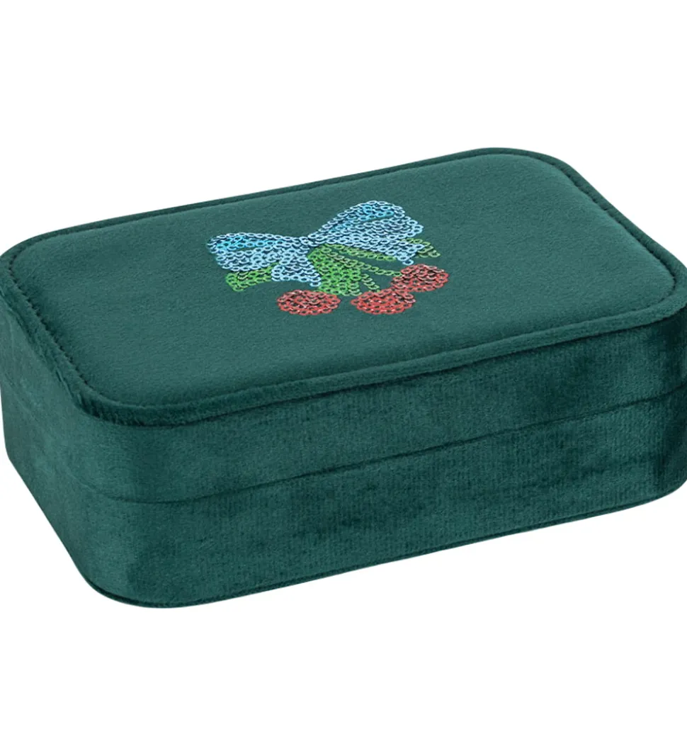 Flot Konges Sløjd smykkeskrin i grønt velour, og på låget er der et motiv med røde bær og en blå sløjfe lavet af pailletter.
