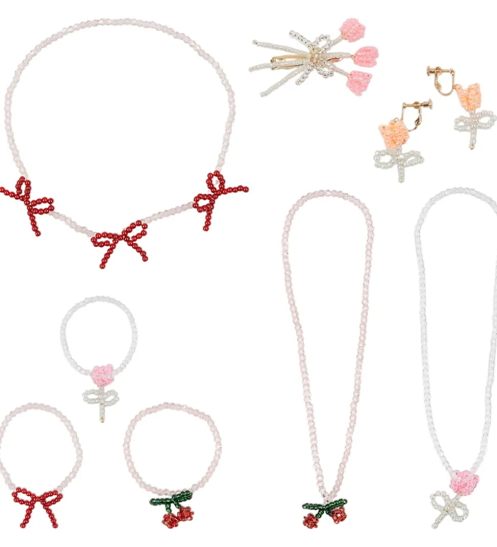 Smykkeskrinet indeholder et par øreringe, et spænde, tre armbånd og tre halskæder, som er elastistiske og derfoe lette at tage af og på for de mindste.