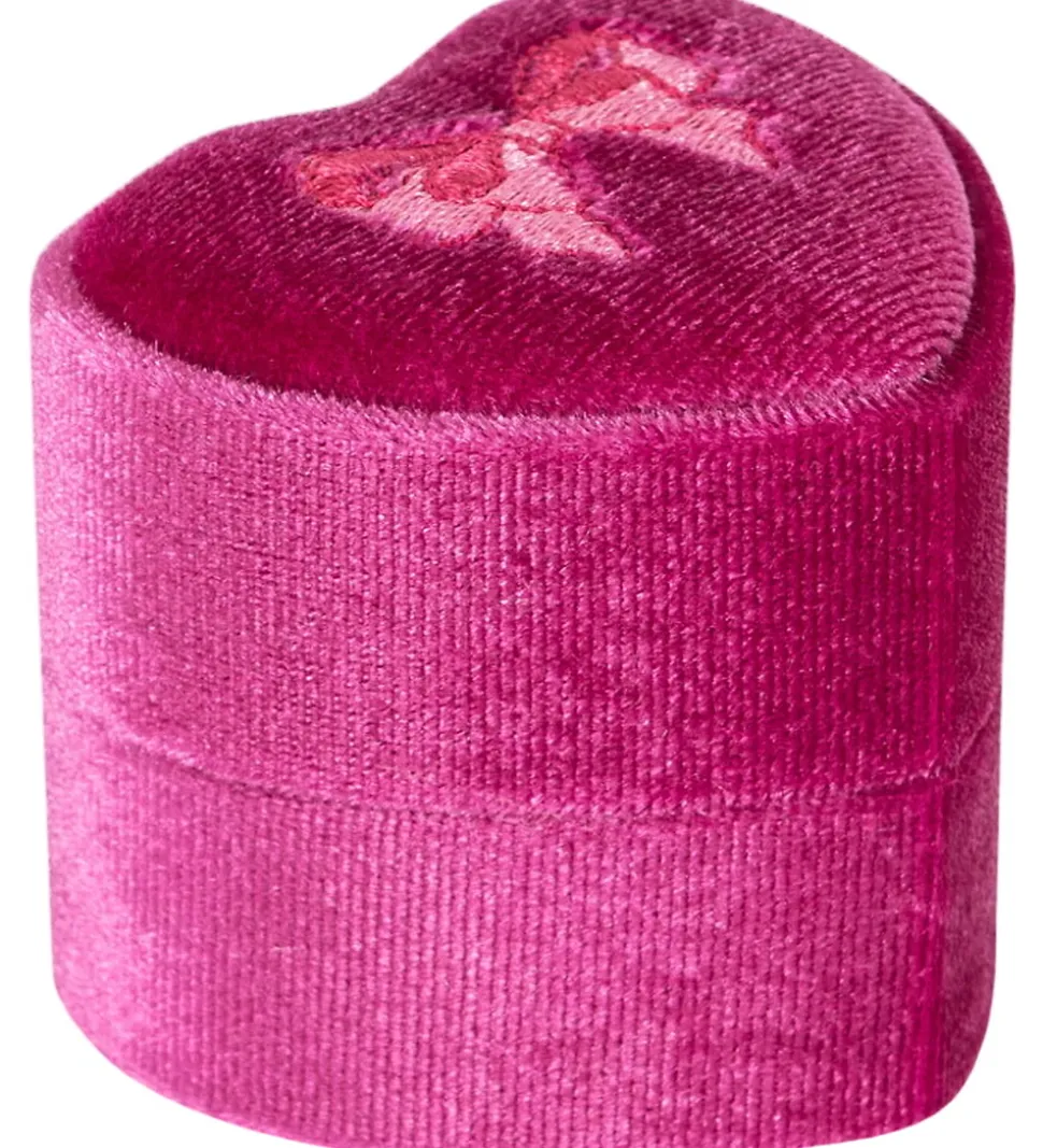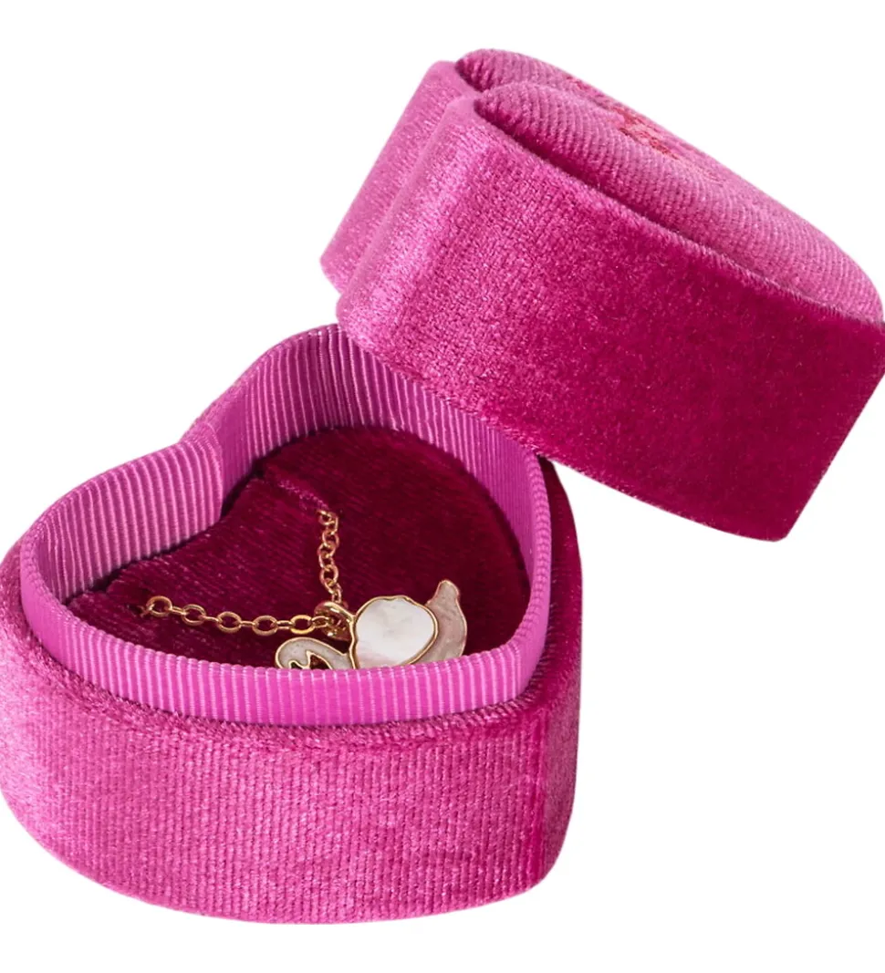 Yndigt Konges Sløjd smykkeskrin i pink velour med en broderet sløjfe på låget. Smykkeskrinet har ét rum indvendigt og inderholder en fin halskæde med svane-vedhæng