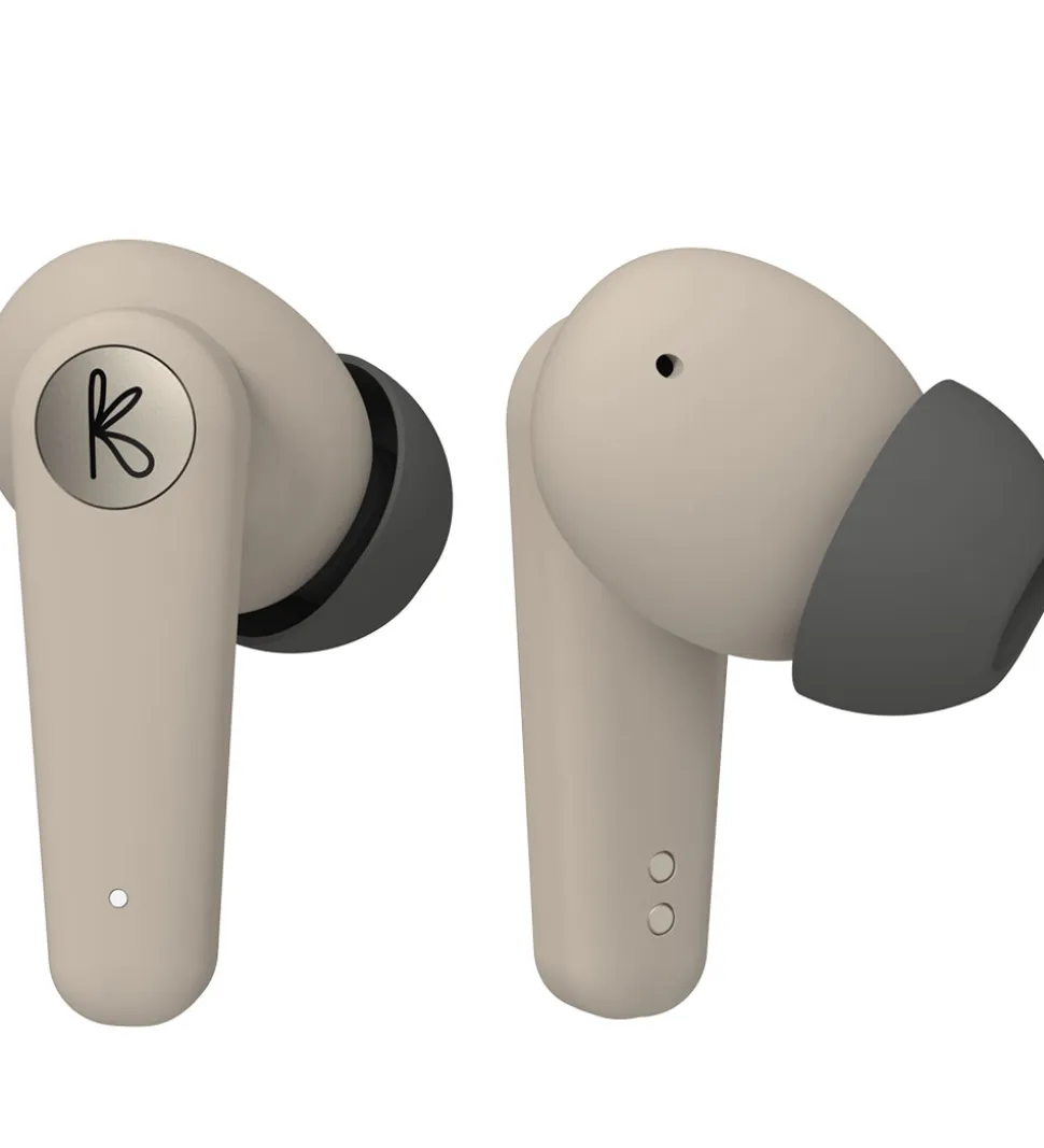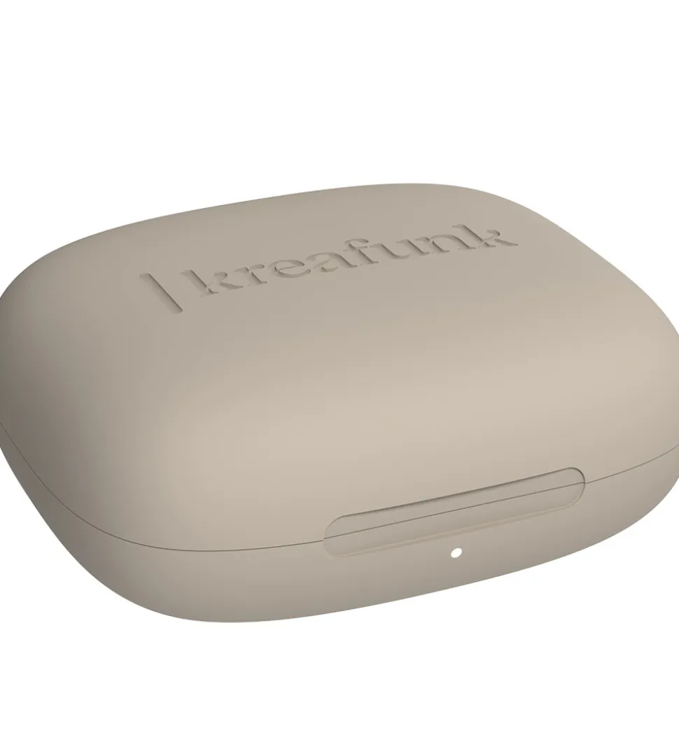 Lækre Kreafunk høretelefoner i et beige farvetema og med et beige lader-etui.
