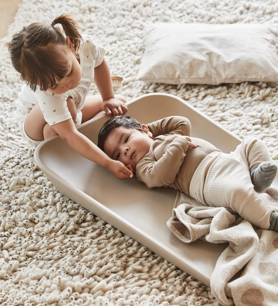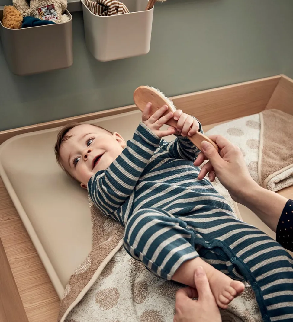 Puslepuden har høje kanter, som sørger for, at babyen ikke triller ned. Undersiden af puden er lavet af træ, som giver en god stabilitet, og der er små gummidutter under, så puslepuden bliver liggende, hvor den skal.