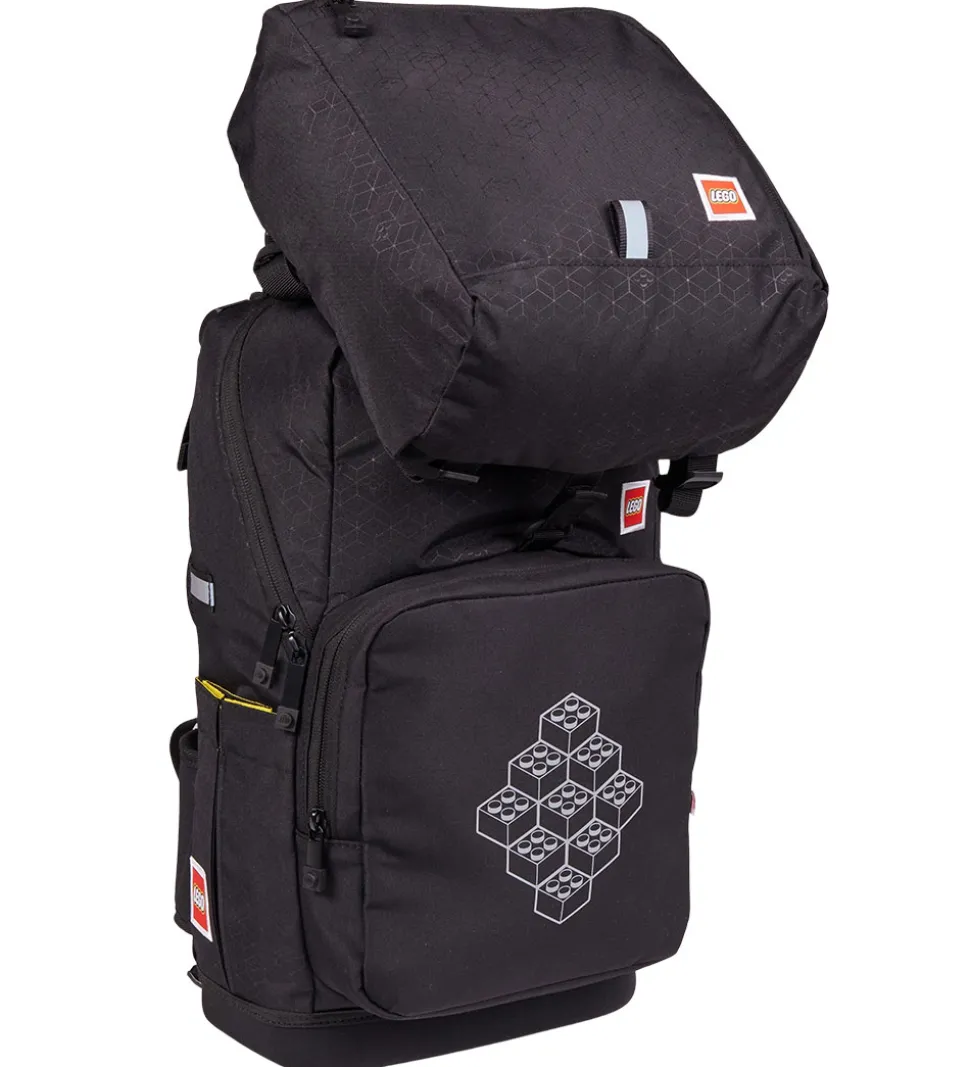 Flot LEGO® skoletaske i sort med et print af LEGO® klodser i grå.