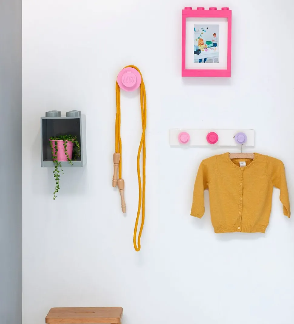 LEGO® Storage knagerækkesættet er både dekorative og praktiske, der kan både hænges jakker, trøjer og bøjler på knagerne. Knagerne er lette og hænge op på væggen, som man ønsker.