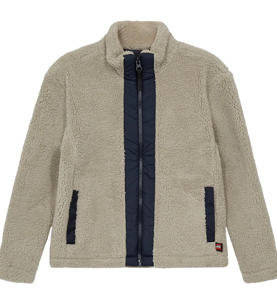 Blød LEGO® Wear fleecejakke af beige teddyfleece med navyblå indsatser i et glatvævet materiale.