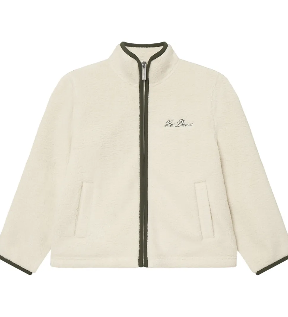 Elegant Les Deux fleecejakke i en blød, råhvid nuance med mørkegrønne kanter. Fleecejakken er lavet af lækkert teddyfleece, der giver et tidløst og stilrent udtryk.