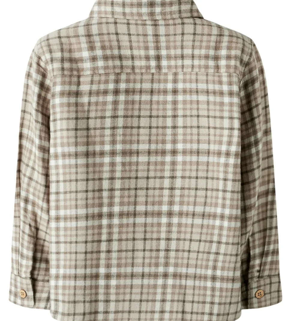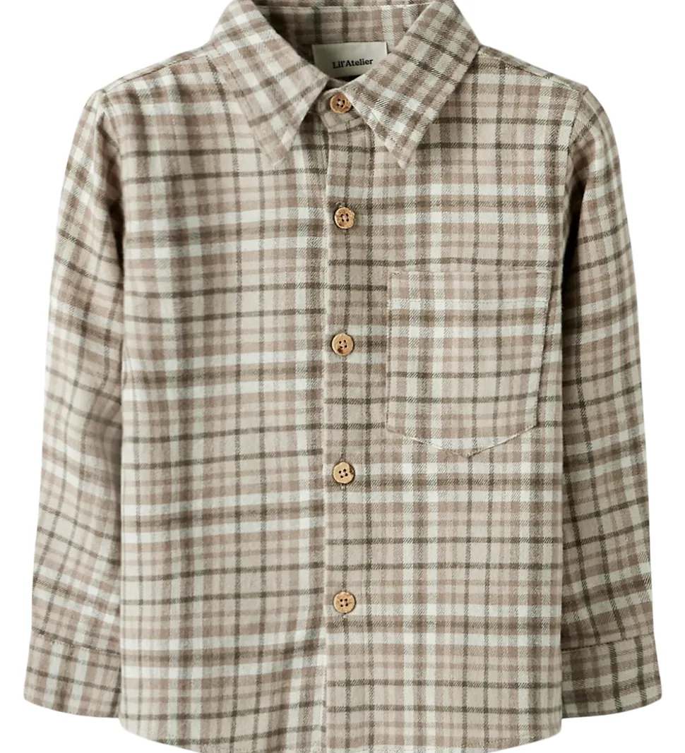 Fin Lil Atelier skjorte med et ternet mønster i beige og brune nuancer. Skjorten er fremstillet i dejlig blød flannel og er med en klassisk, ombukket krave og åben brystlomme. Ærrmerne afsluttes med en slids og knaplukning.