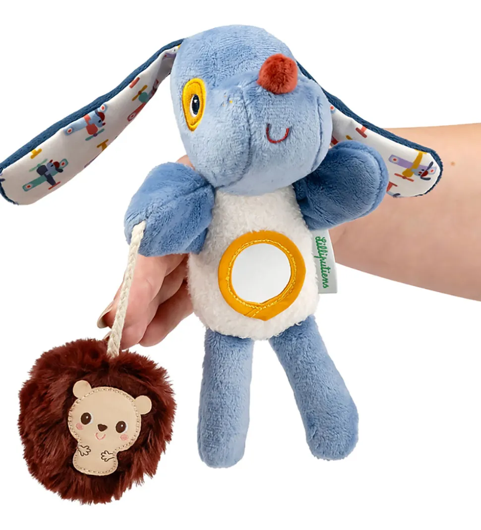 Herligt Lilliputiens aktivitetslegetøj i form af hunden Jules i blå og hvid med mønstrede ører og et spejl på maven. Når man ryster den siger den en beroligende raslelyd. Jules har en snor med et fantasidyr i hånden, som siger en knitrende lyd.