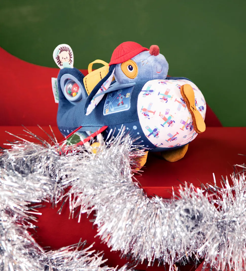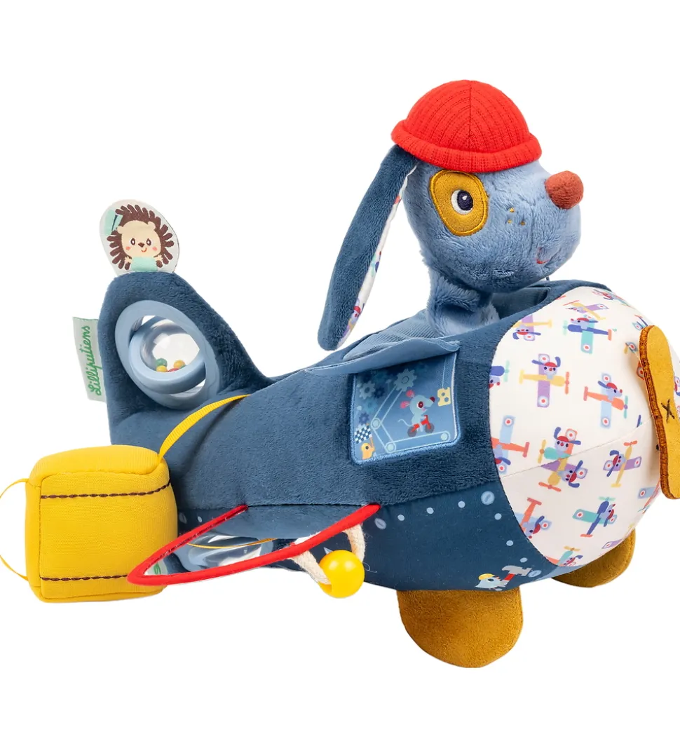 Sjovt Lilliputiens aktivitetslegetøj formet som et fly i blå velour og flot mønster. Flyvemaskinen styres af hunden Jules, og bagved er der en gul kuffert. Flyvemaskinens ene vinge siger en knitrelyd, og har en flap på toppen. Den anden har et spejl. Lilliputiens aktivitetslegetøjet har syv sjove aktiviteter, som kan udforskes.