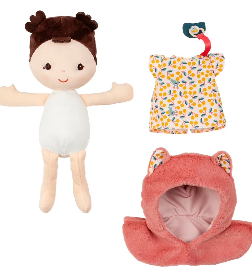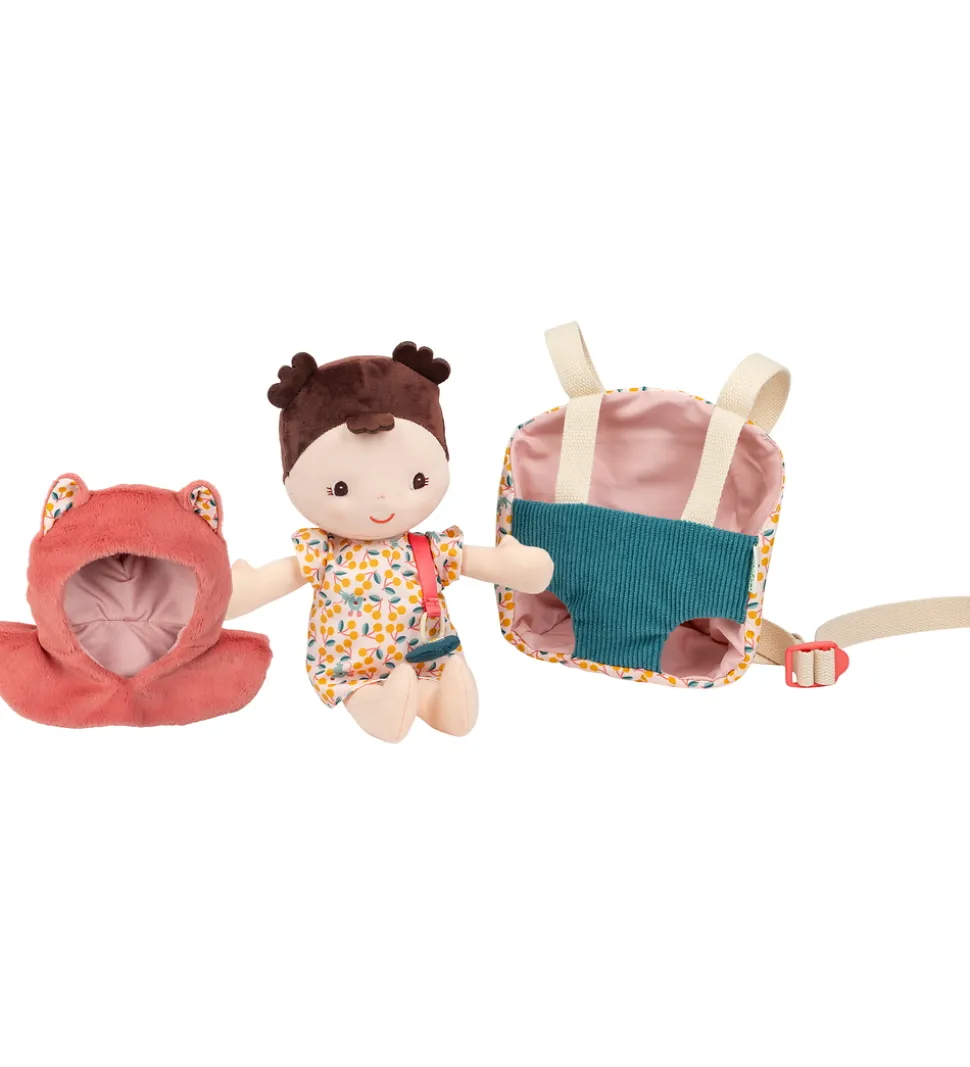 Fin Lilliputiens dukke med farverigt tøj og brunt hår. Dukkens tøj kan tages af og på, og den har en magnetisk sut i munden. Dukken kommer med en bærsele og en varm hue, så den kan komme med på tur. Dukken er blød og dejlig at lege og putte med.