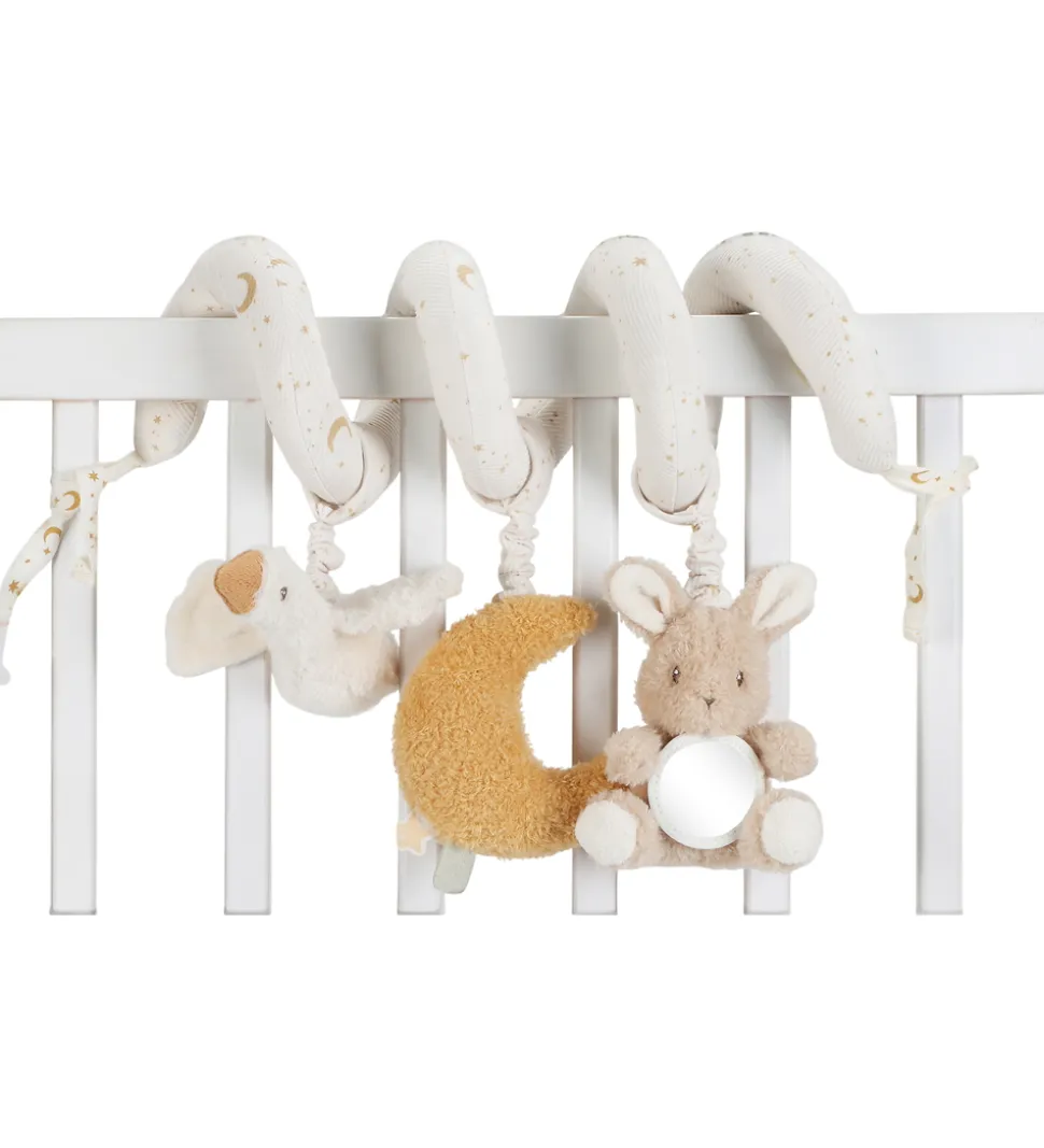 Sød Little Dutch aktivitetsspiral i blødt, hvidt og beige tekstil med ophæng af plyssede bamser med aktiviteter.