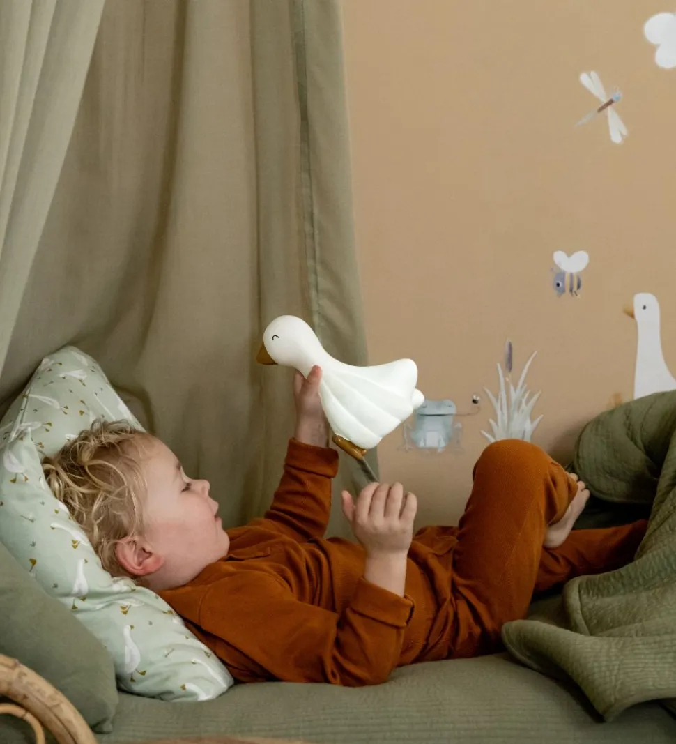 God Little Dutch natlampe, med form som en gås i hvid og orange.