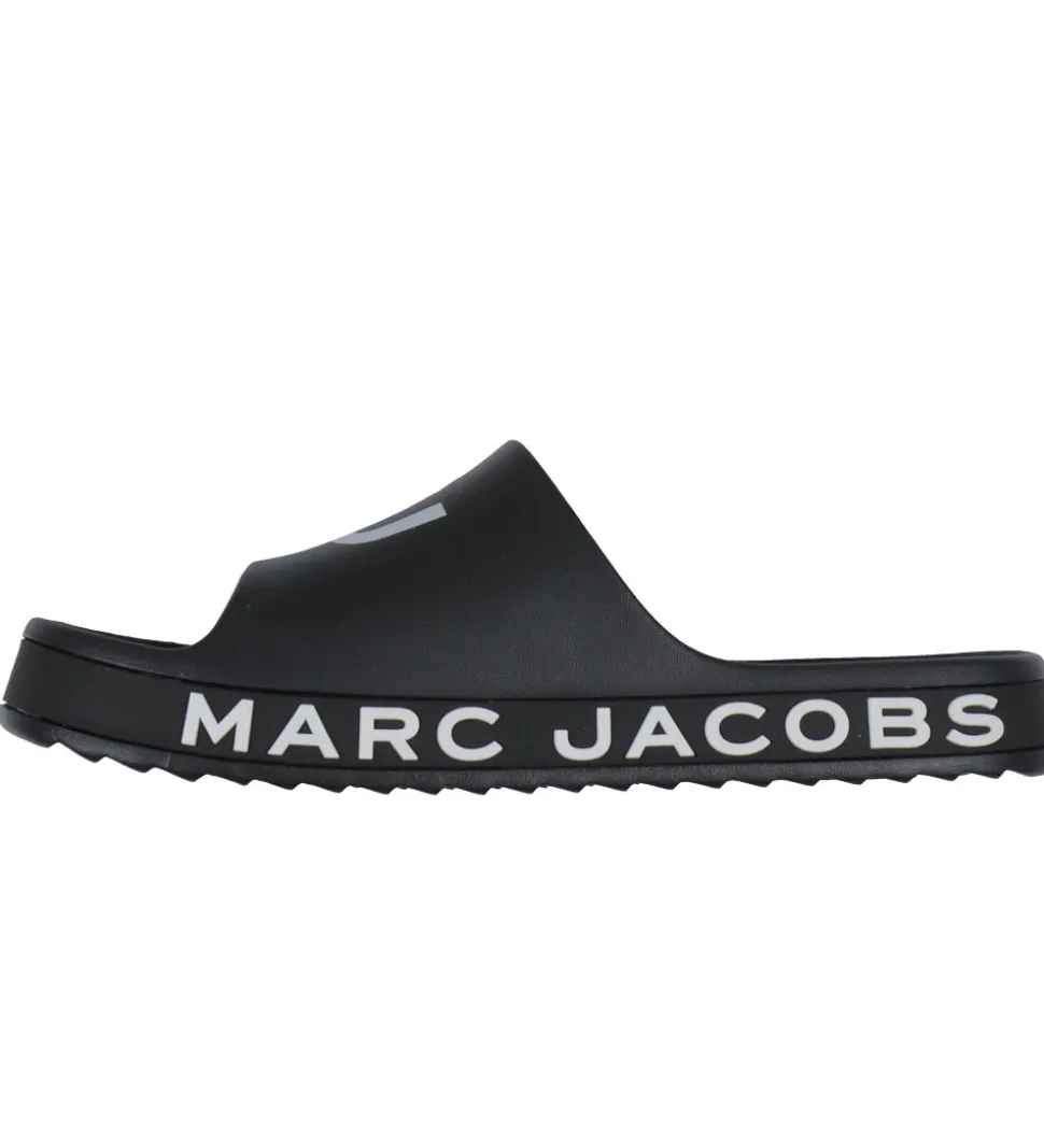 Smarte Little Marc Jacobs badesandaler i ensfarvet sort med “MJ” printet i hvid på fodremmen, mens der langs ydersålerne står Marc Jacobs med hvid skrift.
