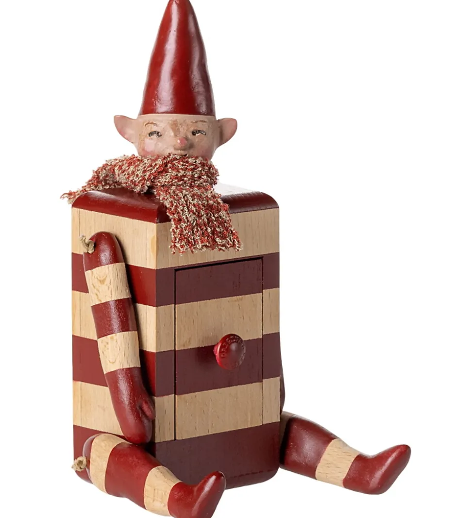 Charmerende Maileg alf med røde og naturfarvede striber samt en spids, rød nissehue. Maileg alfen har en hemmelig, lille skuffe, hvilket gør den til en yndig tilføjelse i ethvert hjem. Perfekt til at skabe julestemning.