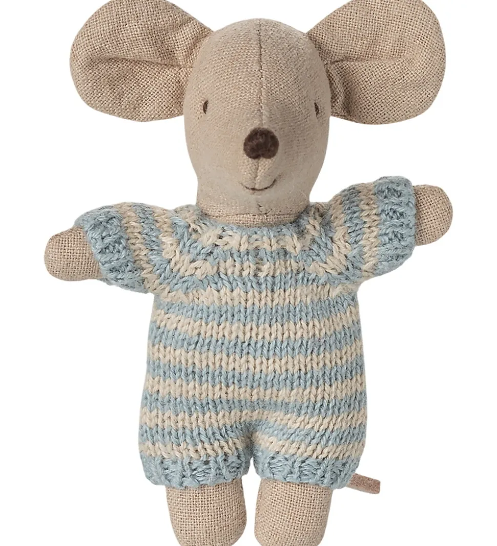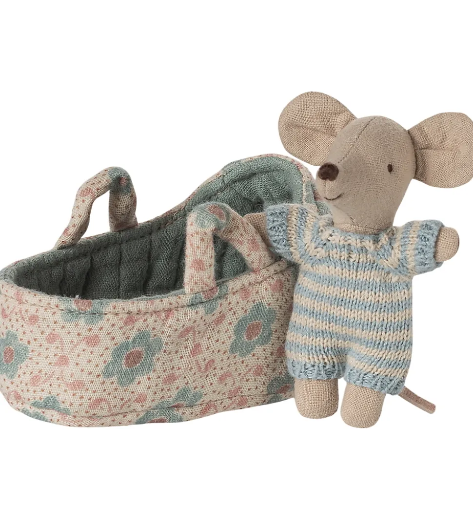 Skøn Maileg babymus med en stribet, lyseblå body. Babymusen kommer med en blomstret babylift i beige nuance med blå blomster, perfekt til kreativ leg. Maileg sikrer charmerende design og høj kvalitet.