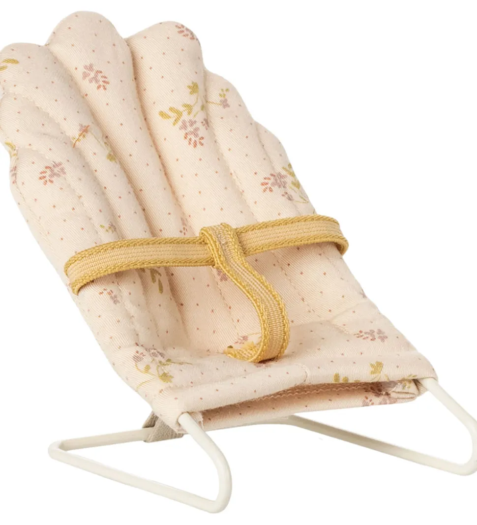 Fin Maileg skråstol en blød beige nuance med et fint blomstermønster og med en gul sele. Skråstolen er i et vintage-design og lavet af metal og tekstil.