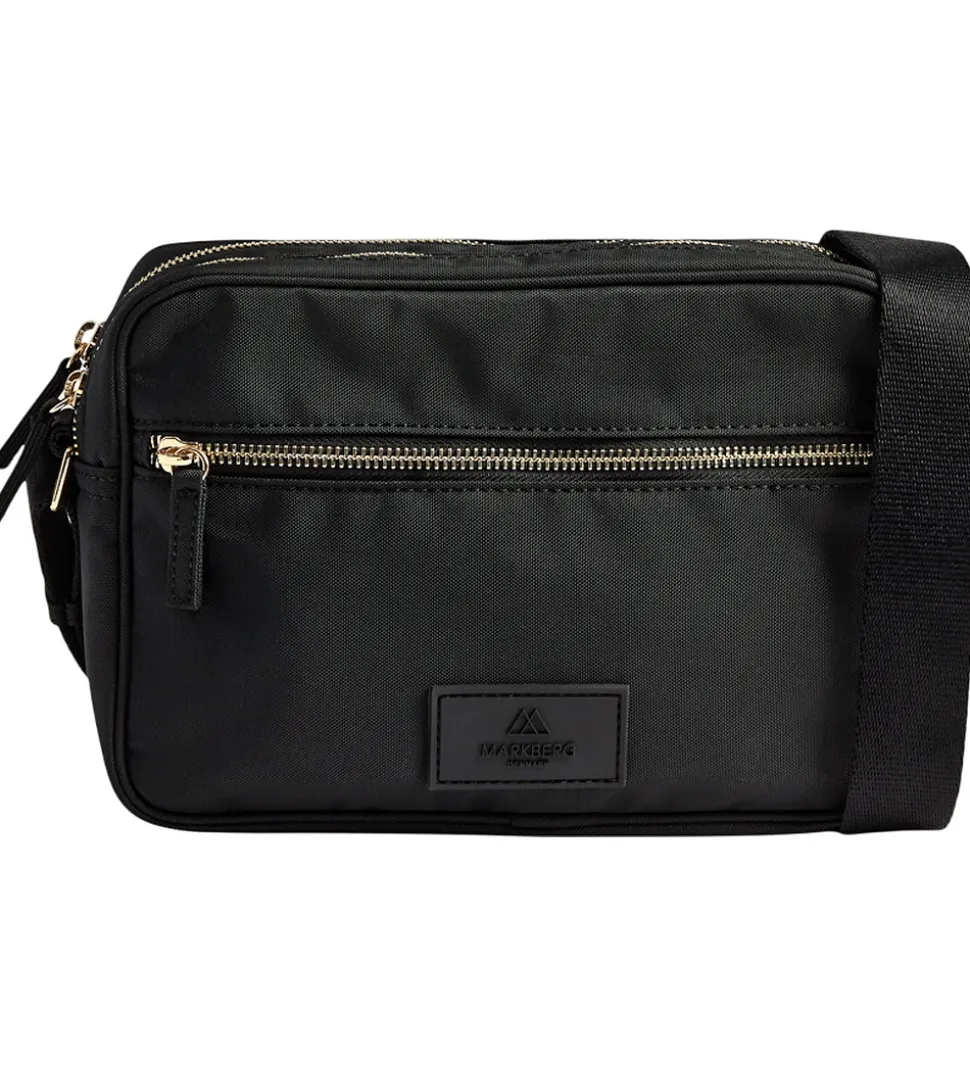 Fin Markberg skuldertaske i sort med et logo fortil.