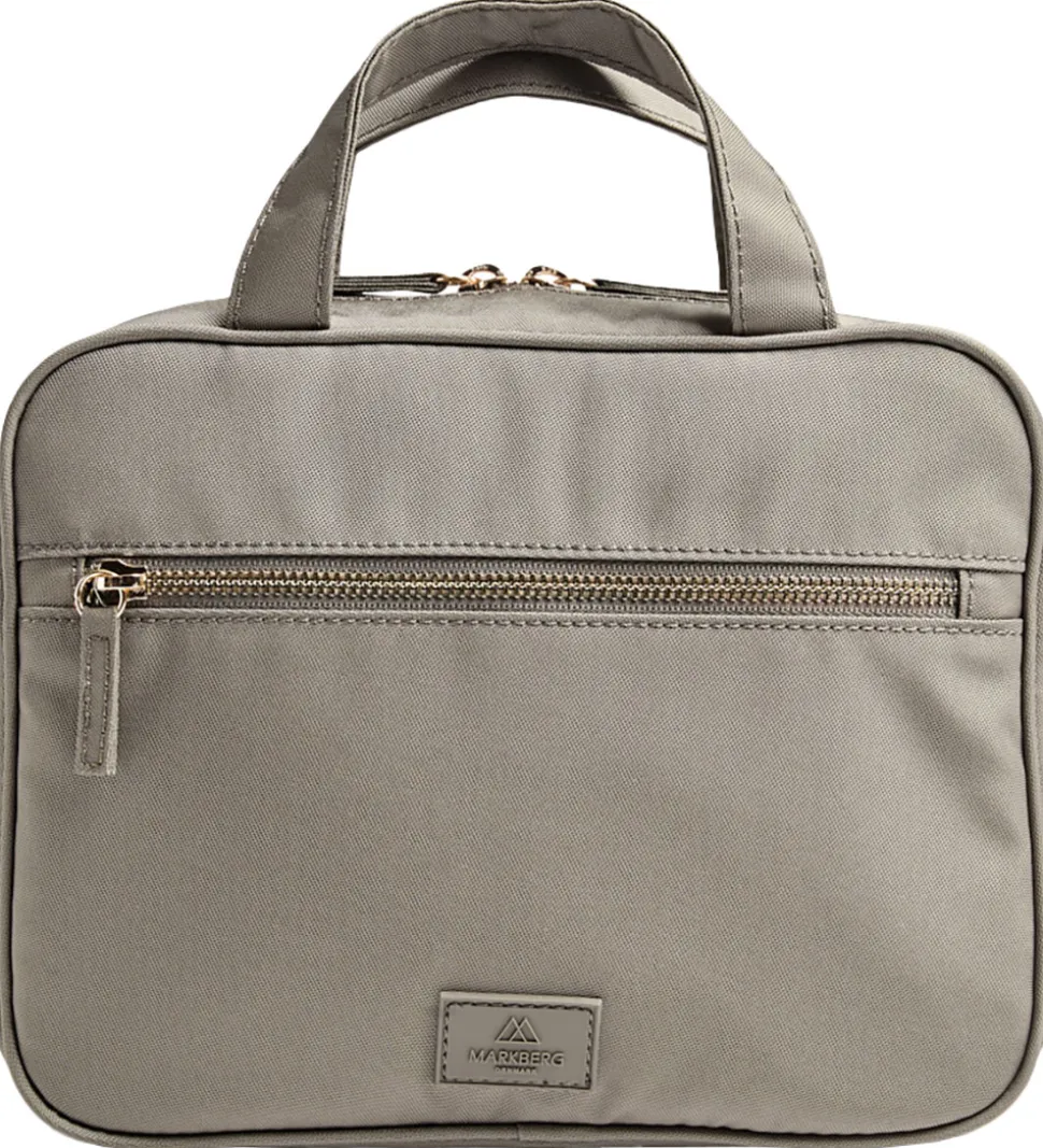 Markberg toilettasken består af ét stort rum, som åbnes med en dobbeltgående lynlås i toppen. Indvendigt er den delt op med en lynlåslomme i midten, og så er der stiklommer i foret til smart organisering. På fronten er der yderligere en mindre lynlåslomme. Toilettasken har to bærehanken i toppen.