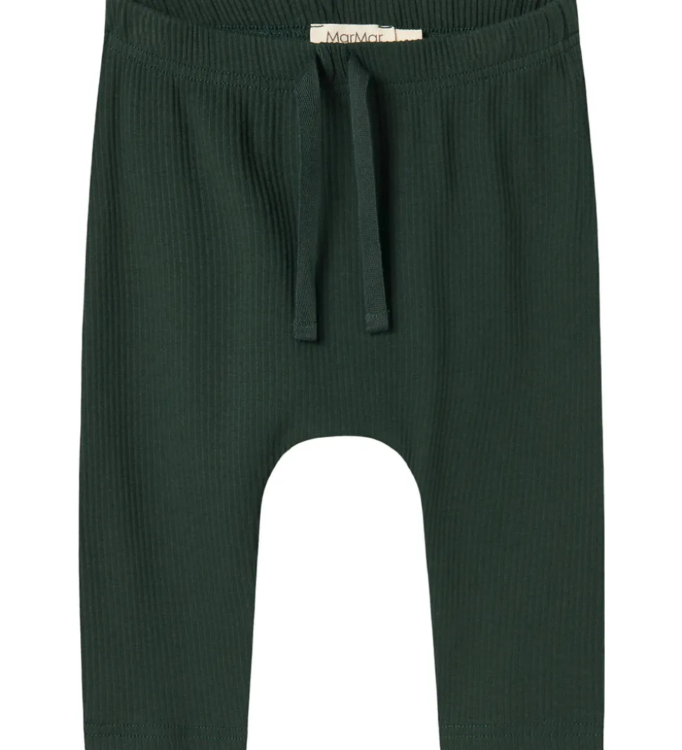 Flotte bukser fra MarMar i en dyb, mørkegrøn nuance. Bukserne fra MarMar har en ribbet struktur, der fremhæver det enkle design. Modellen er udstyret med en elastisk talje, der kan justeres med snøre for optimal pasform. Benene afsluttes med lige kanter, der giver et klassisk look. Der er ingen synlige print eller mønstre, hvilket understreger det stilrene udtryk.