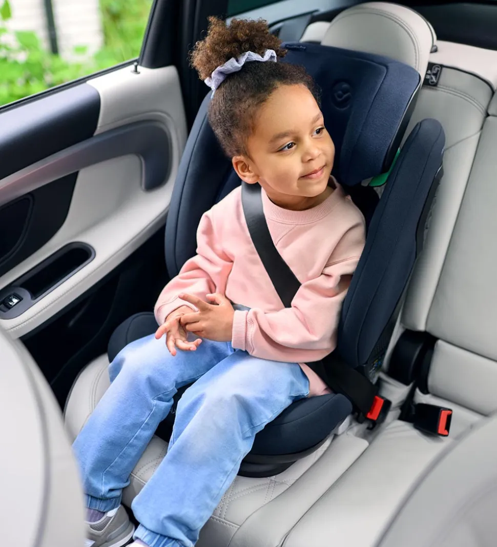 Med en knap bagpå kan man nemt regulere højden på ryggen og nakkestøtten, og der er god plads til skuldrene, efterhånden som barnet vokser. Som en praktisk detalje kan siderne vippes ud, så stolens brede kan udvides i takt med, at barnet bliver større.