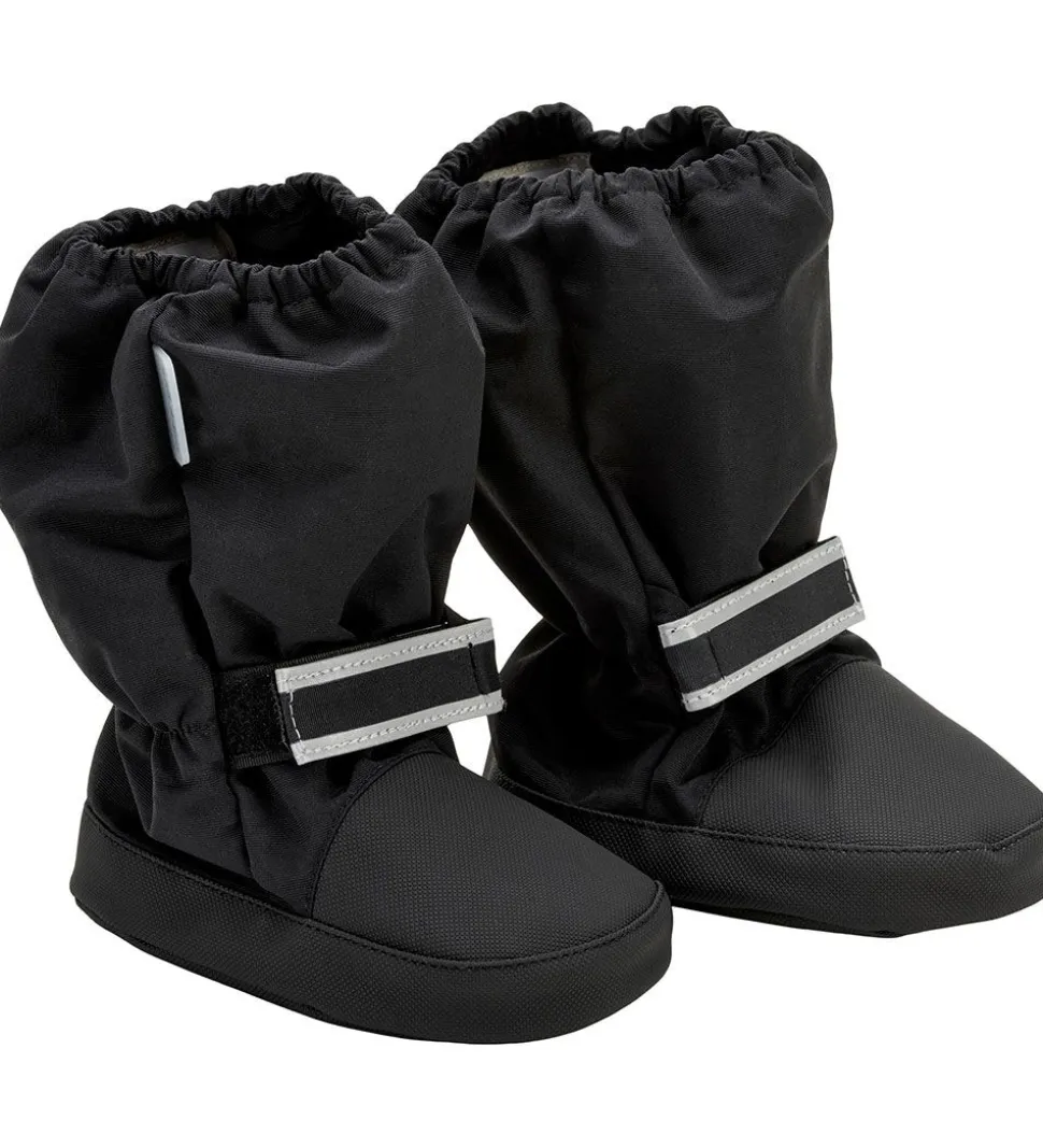 Under fødderne og på oversiden af tæerne er der sorte forstærkninger. Overtrækkskoene er forede med blødt, gråt fleece.
