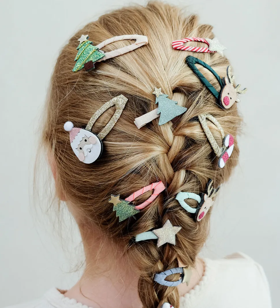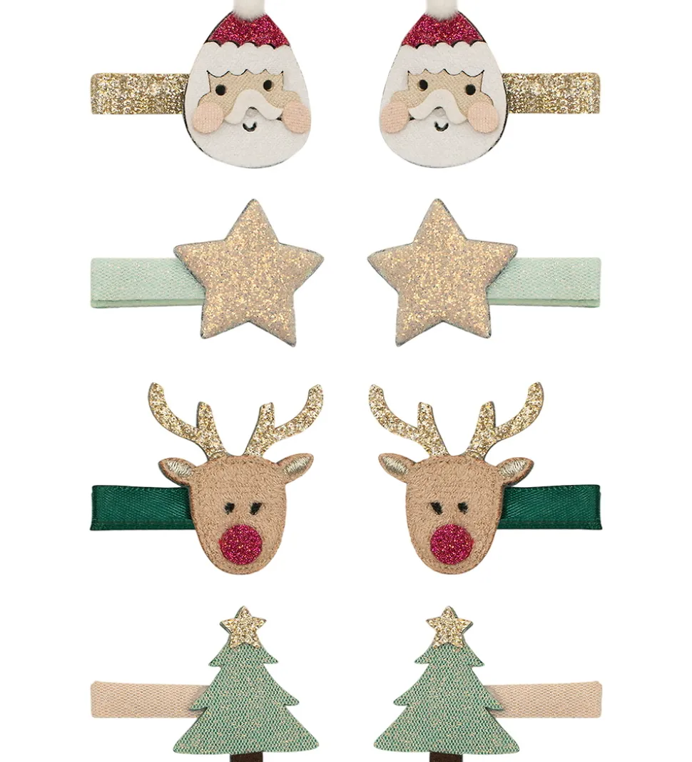 Flotte Mimi & Lula hårklips, som består af 4 sæt med hver to hårspænder med de samme motiver. Alle hårklipsene har flotte julemotiver med glitrende detaljer i guld eller rød. Perfekt til højtiden.