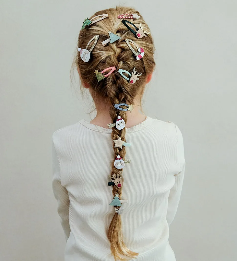 Charmerende Mimi & Lula hårspænder, som består af to sæt med hver to hårspænder med de samme motiver. De ene sæt er grønt med et rensdyrmotiv i brune toner, og det andet sæt er guldfarvet med glimmer med festlige slikstokke i rød og hvid. Mimi & Lula tilføjer et sjovt præg til enhver frisure.