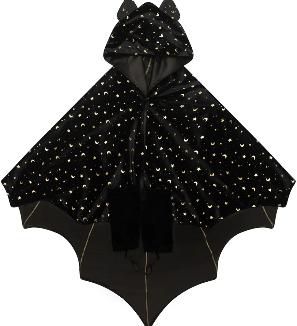 Sød Mimi & Lula kappe, der er en flagermus-udklædning, i sort velour plys med et flot natte-alloverprint med glimmer.