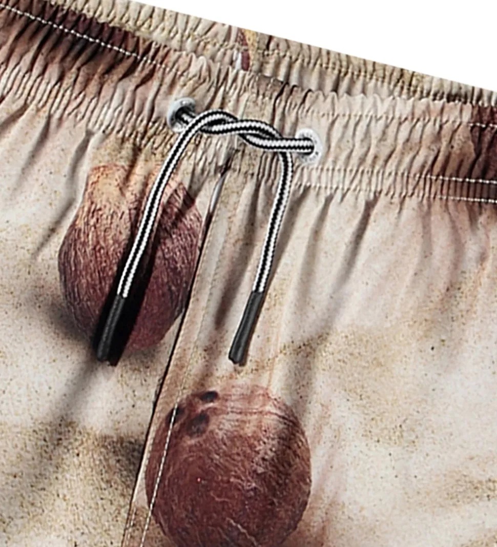 Smarte Molo badeshorts i sandfarvet med print af kokosnødder og med et logo på venstre lår i neongul. Badeshortsene har en god elastik i taljen, som kan justeres med snøre. Indvendigt er der net med elastik i benåbningerne.
