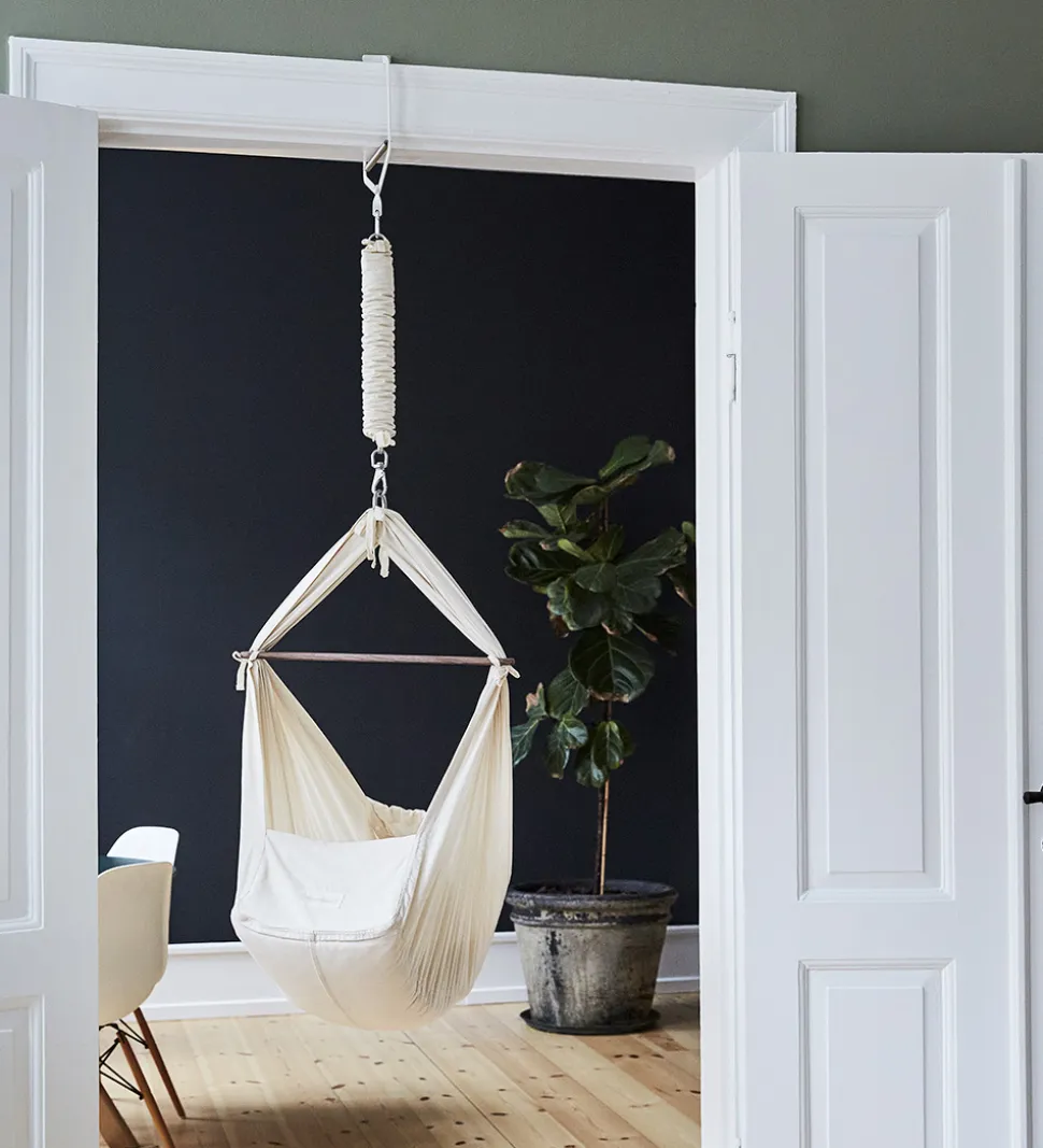 Praktisk Moonboon fjeder til vugge og tvillingeslyngevugge i cremehvidt tekstil og sølvfarvet metal.