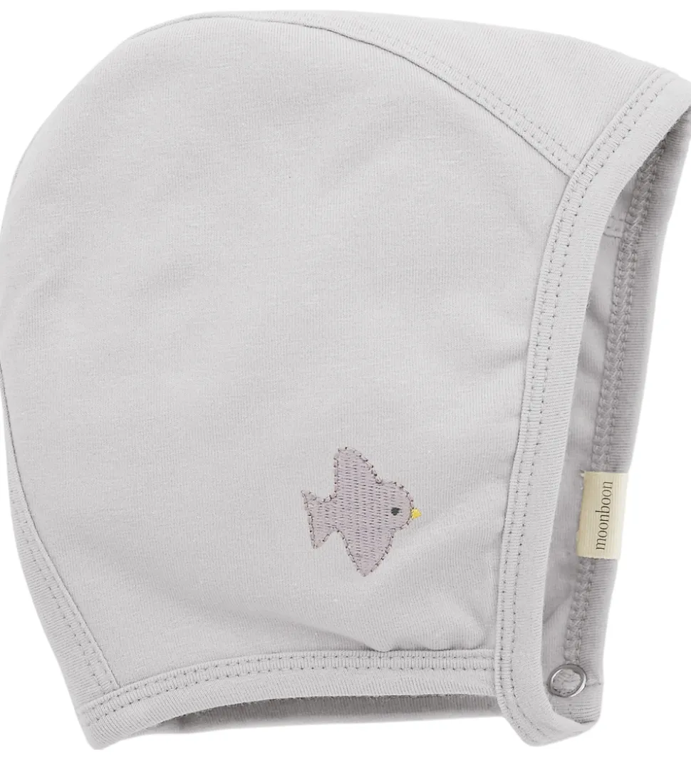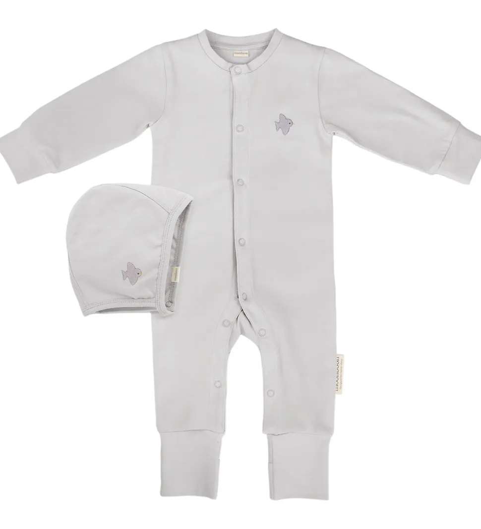 Dejlig Moonboon natdragt med babyhjelm i gråbeige med en broderet fugl. Moonboon natdragten med babyhjelm leveres i en fin gaveæske.