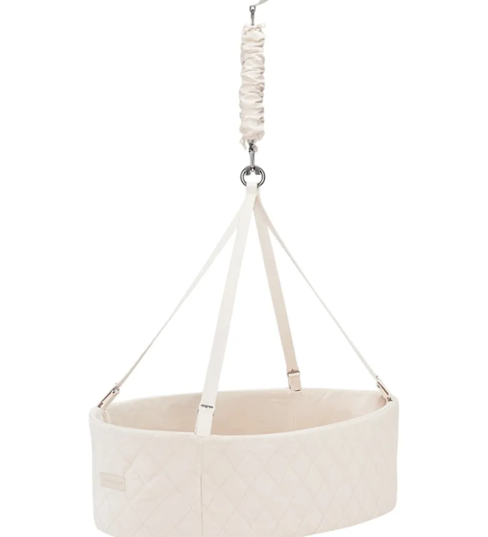 Fin Moonboon oval vugge i cremefarvet med quiltet struktur. Vuggen leveres med: