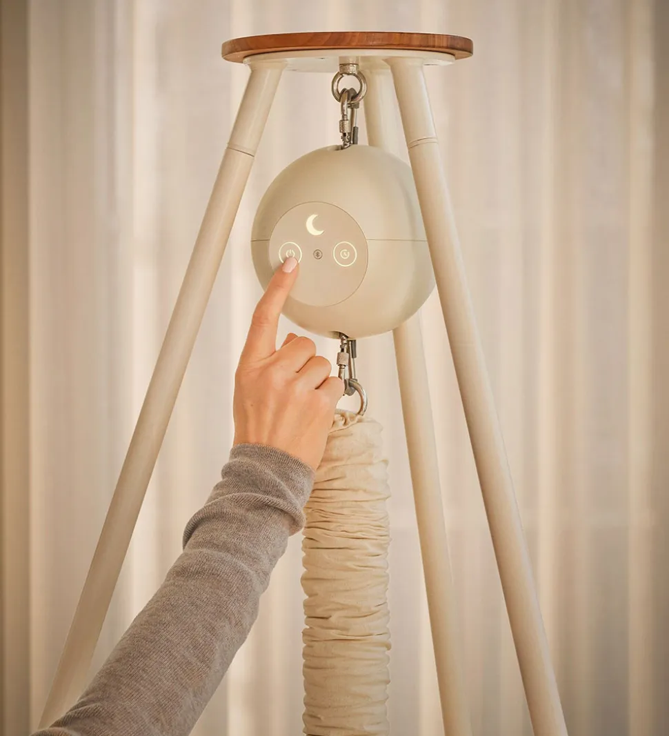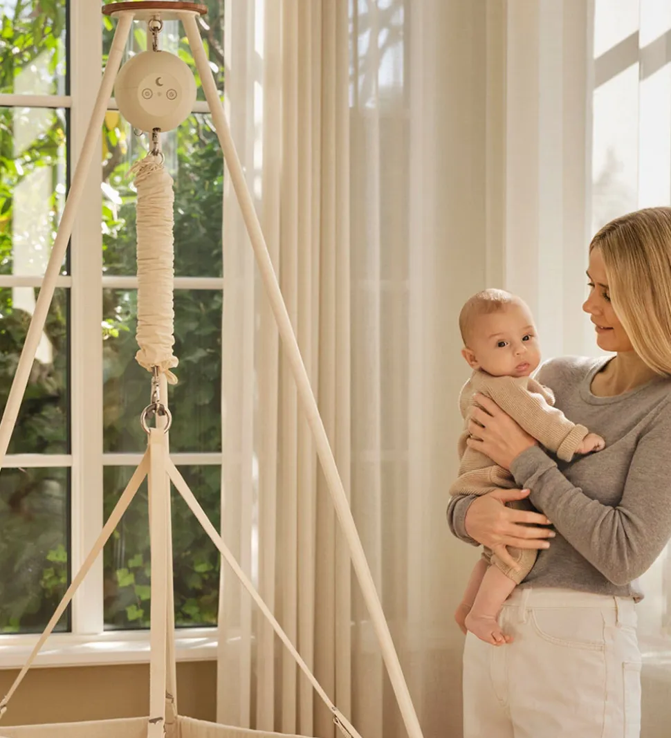 Moonboon vuggemotoren er praktisk redskab til småbørnsforældre, der ønsker en hjælpende hånd, når baby skal vugges i søvn. Vuggemotoren bruges i kombination med Moonboons slyngevugge, tvillingeslyngevugge eller vugge samt et Moonboon stativ, loft-ophæng eller karm-beslag.