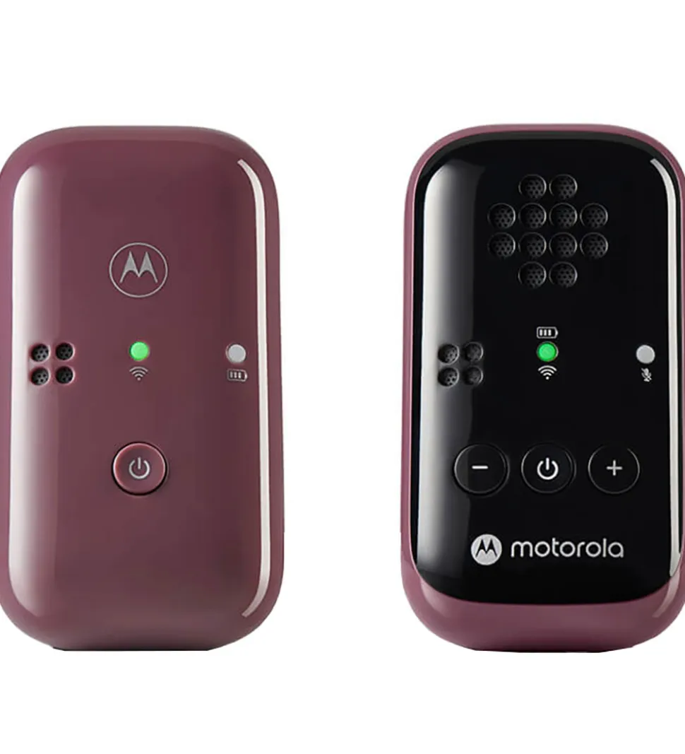 Smart Motorola babyalarm i en praktisk rejseudgave med et lilla farvetema. Der medfølger en sort opbevaringspose med snørelukning, så de er nemme at have med på farten.