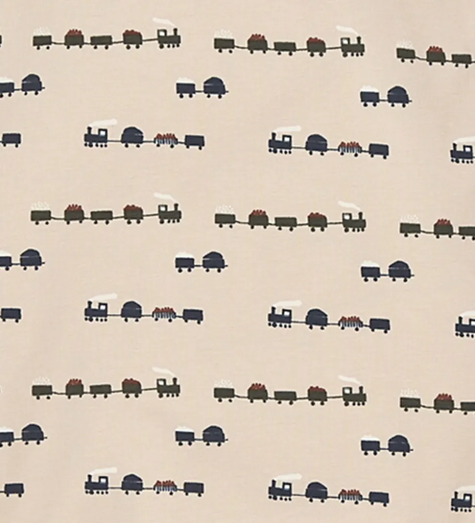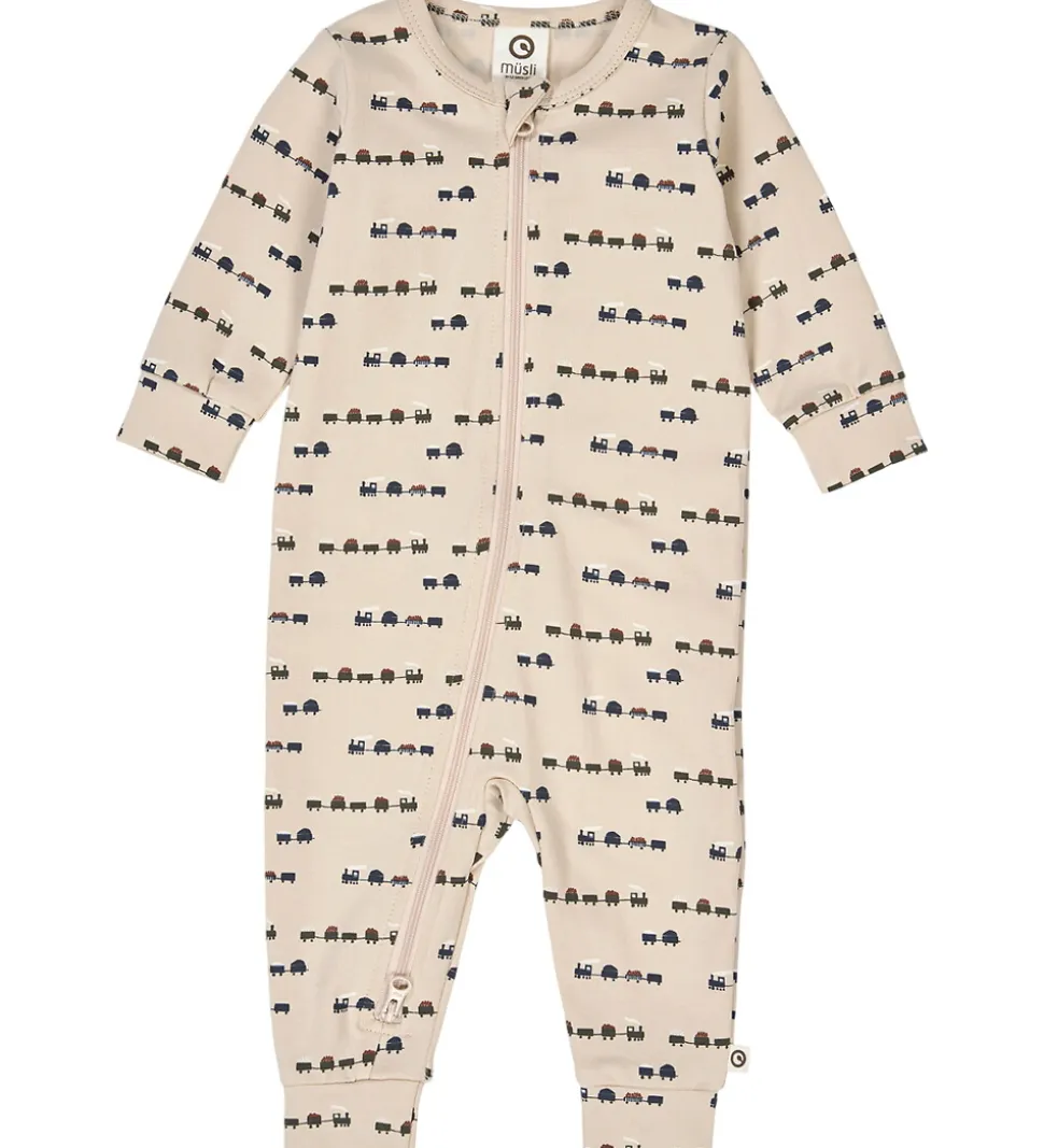 Charmerende Müsli heldragt i en lys beige nuance og dekoreret med tog i brune nuancer.