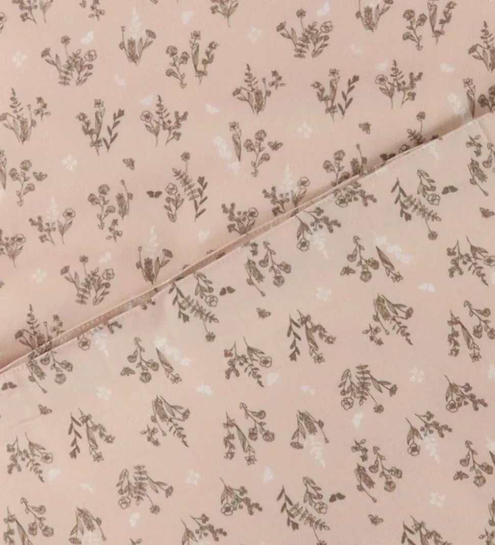Blødt Müsli sengetøj i rosa med blomsterprint i brun og hvid.