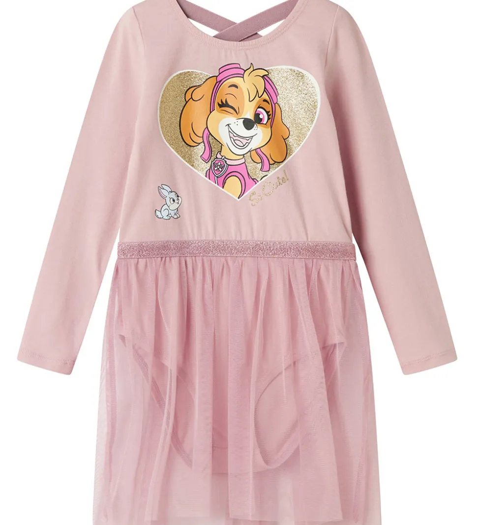 Fin Name It gymnastikdragt i rosa med et stort print på fronten af et hjerte i guld glimmer med en Paw Patrol figur indeni og en sød kanin.