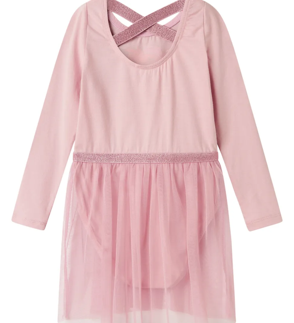 Name It gymnastikdragten har en rund halsudskæring med elastiske stropper som krydser på ryggen. Den har lange ærmer og elastik i benåbningerne. Gymnasikdragten har en elastik omkring taljen, hvorfra der falder en let tylskørt.