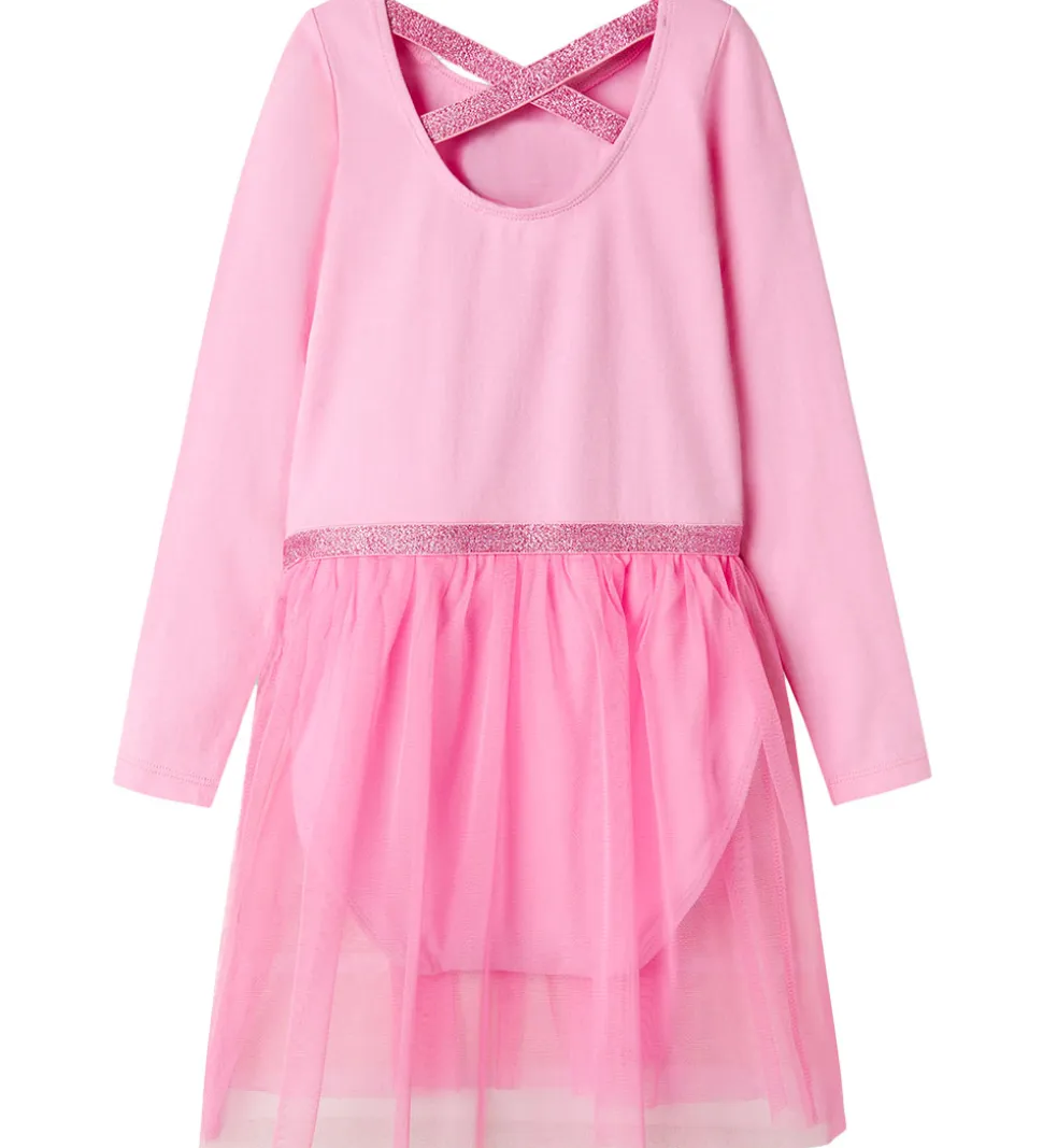 Name It gymnastikdragten har lange ærmer og en rund halsudskæring. Bagtil er der en dyb, buet udskæring som holdes på plads af fine glimmerstropper, som krydser hinanden. I taljen er der en isyet glimmerelastik, hvorfra et lag tyl danner et skørt med god vidde og fine folder. Langs hals- og benudskæringer er der smalle elastikkanter som sikrer en god og behagelig pasform og dragten er i en blød og strækbar kvalitet.