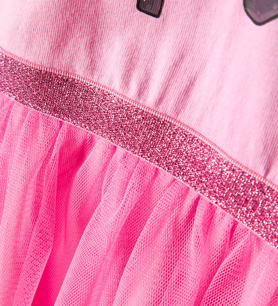 Sød Name It gymnastikdragt i rosa med et matchende tylskørt og et fint tekst- og katteprint på brystet i sort, hvid og lilla.
