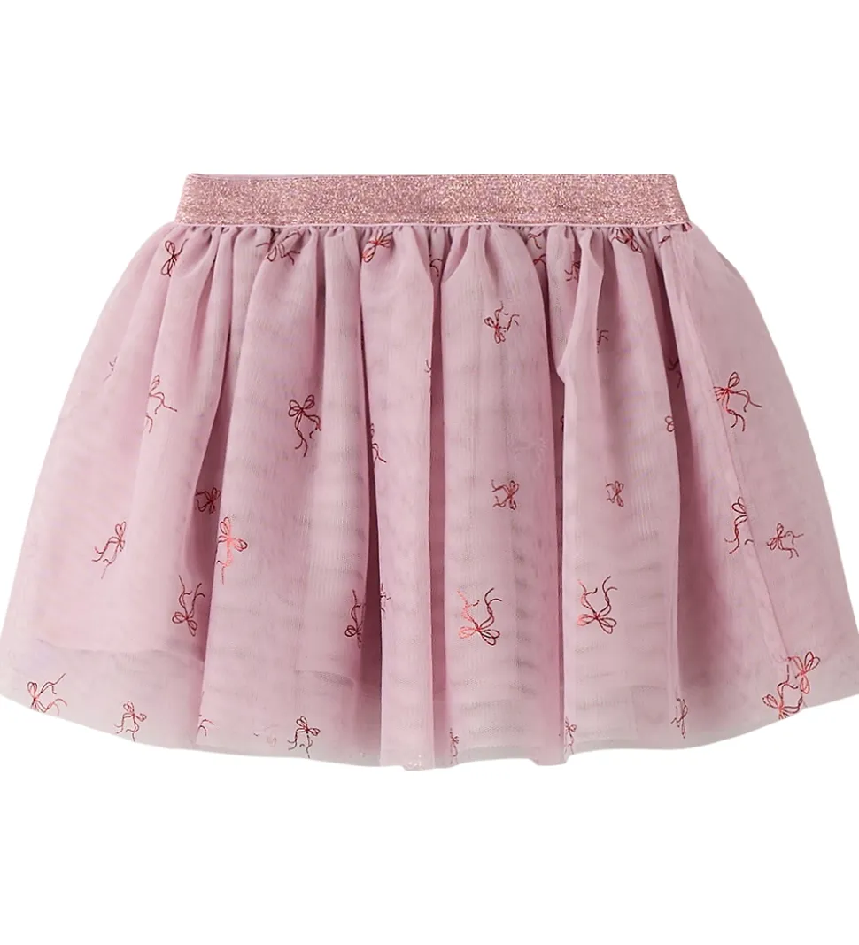 Sød Name It nederdel i rosa med print af små sløjfer i rød glimmer. Nederdelen har en elastik i taljen med rosa glimmer. Den består af et lag genanvendt polyester inderst og flere lag tyl yderst.
