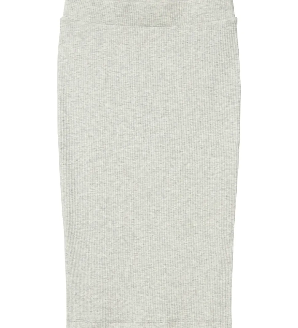 Flot Name It nederdel i meleret lysegrå med ribstruktur. Nederdelen er en mellemlang model med tætsiddende pasform. Den har en bred elastik i taljen, og en slids nederst i begge side.