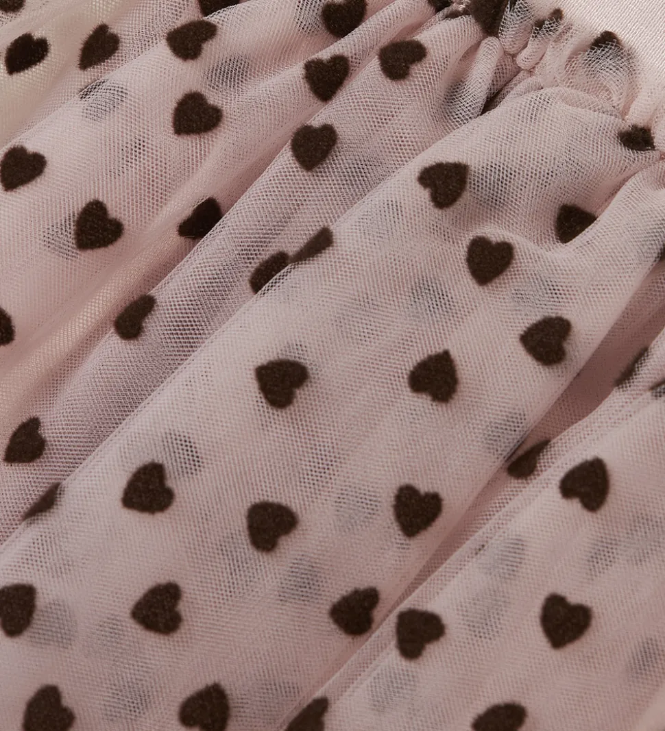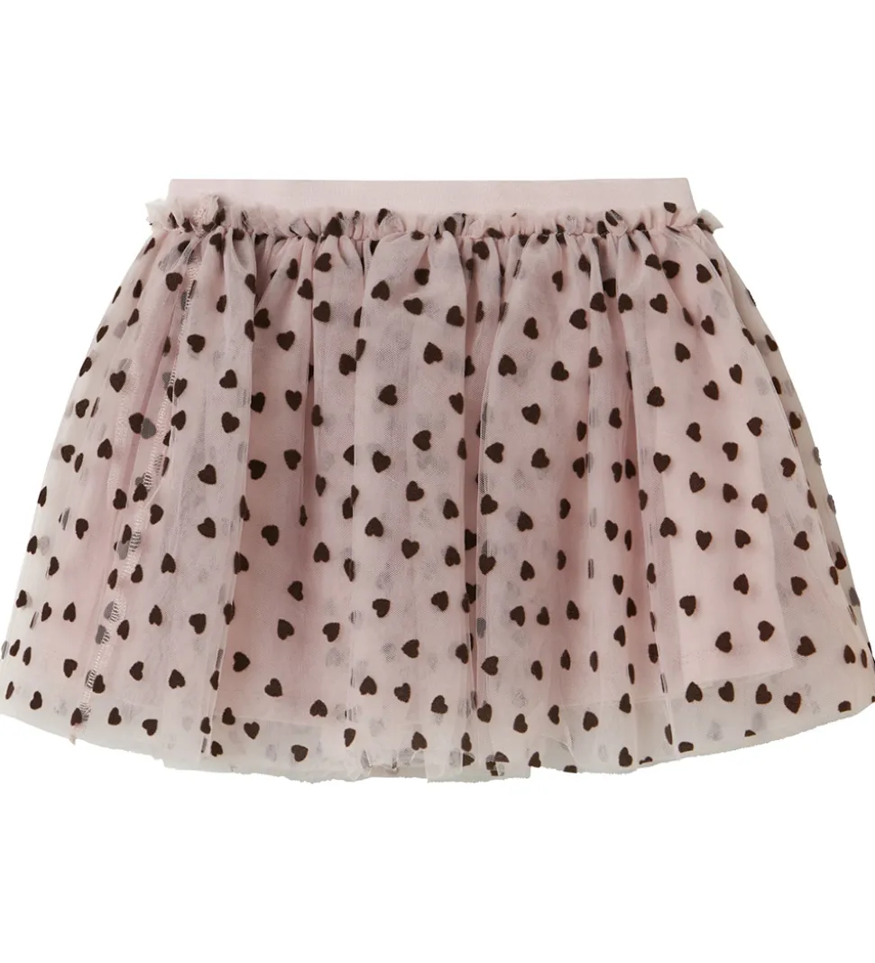 Fin Name It nederdel i en sart, rosa nuance dekoreret med små, mørkebrune hjerteprint. Name It nederdelen har en let og luftig pasform med elastik i taljen, hvilket giver en god pasform. Nederdelen har flere lag tyl, der skaber et voluminøst udtryk.