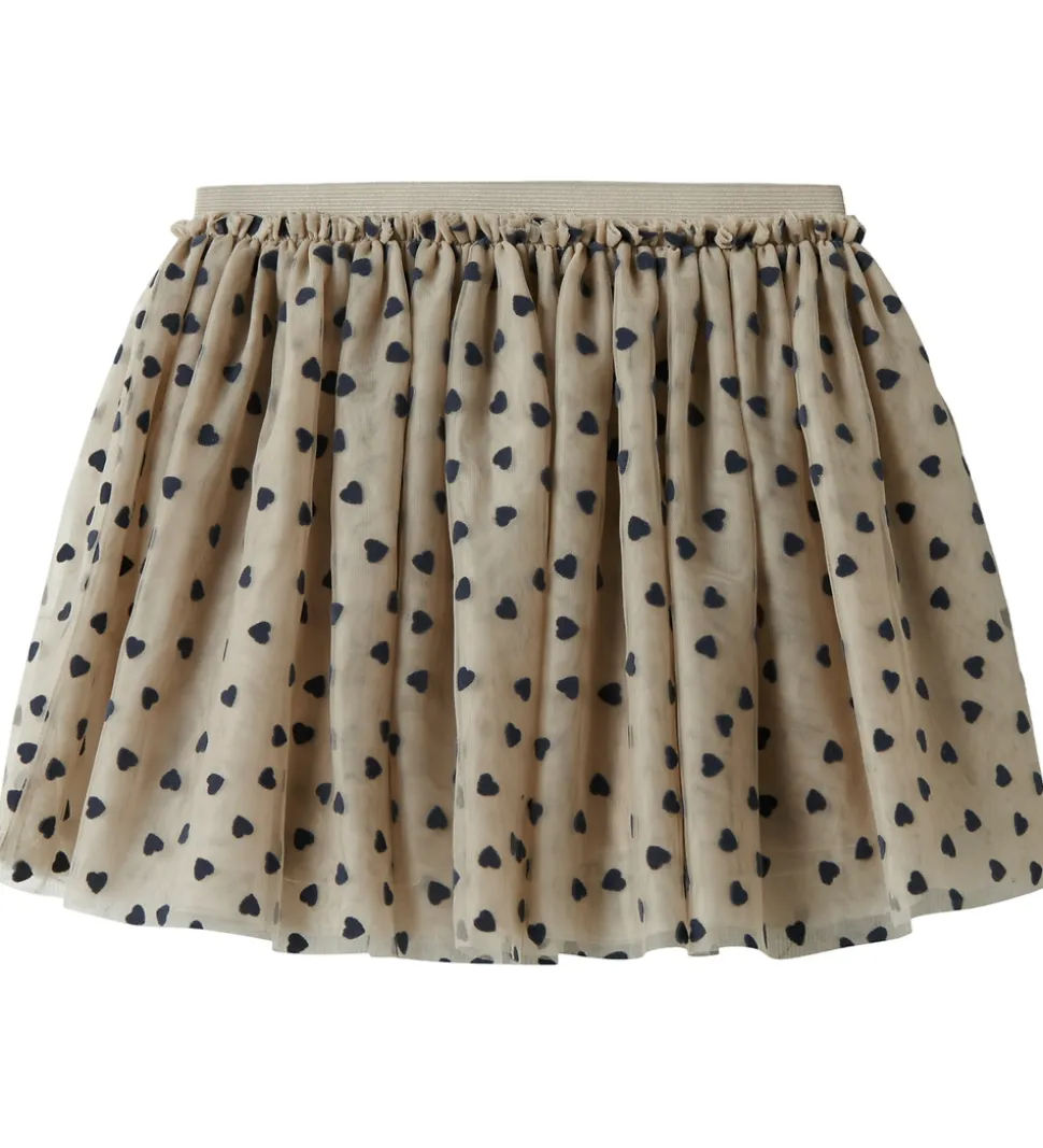 Fin Name It nederdel i en mørk beige med mørkeblå hjerter. Name It nederdelen har en løs pasform og en elastisk talje, der sikre en god pasform.