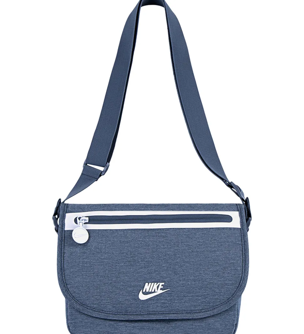 Praktisk Nike køletaske i blågrå med et hvidt Nike logo og en hvid stribe på fronten.
