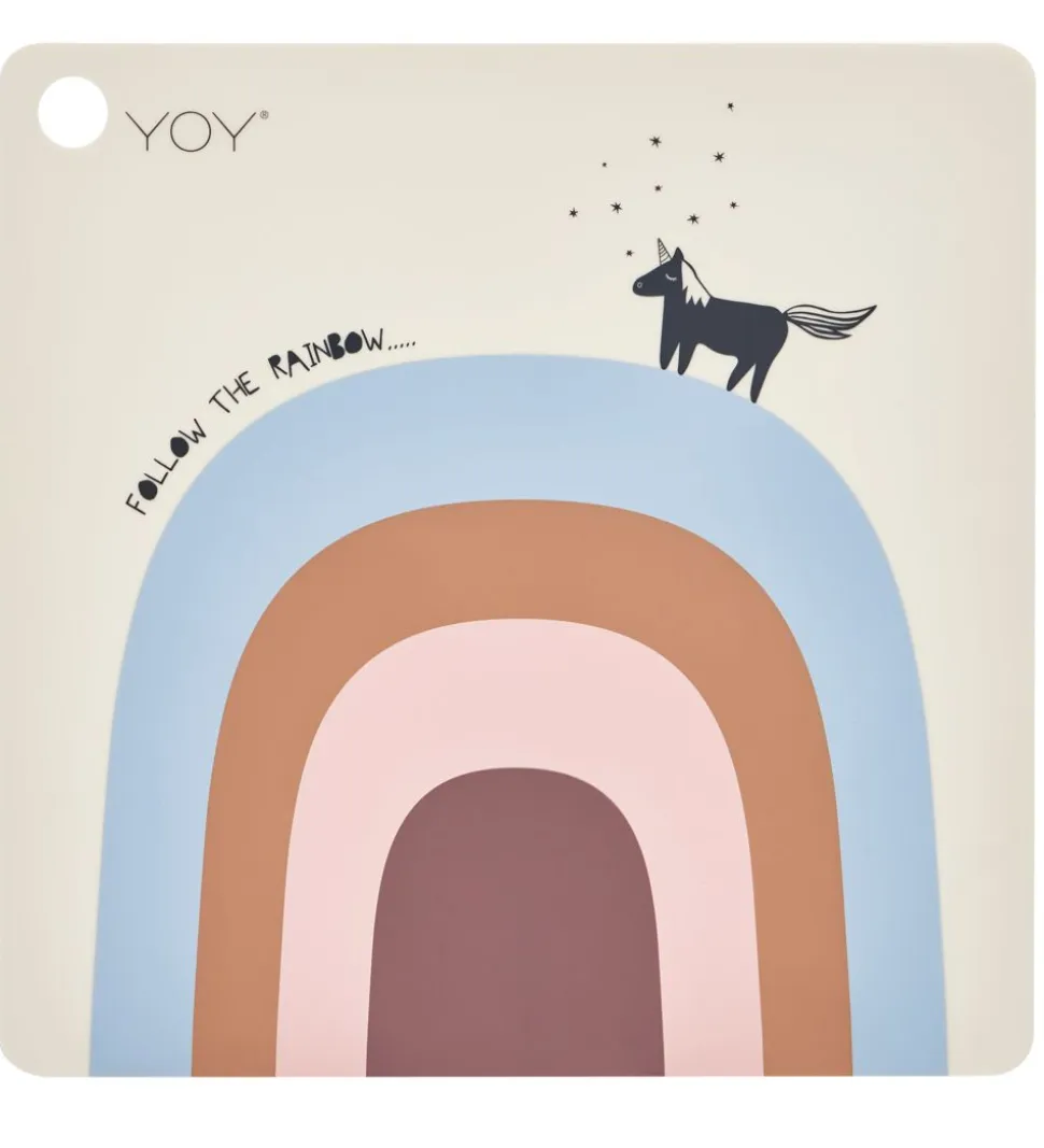 Smart OYOY dækkeserviet i beige, med en firkantet form og print af en regnbue, med “Follow the rainbow” og en enhjørning i sort.