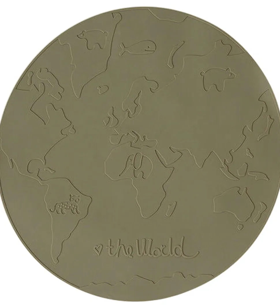 Smart OYOY dækkeserviet i armygrøn og med et motiv som jordkloden.