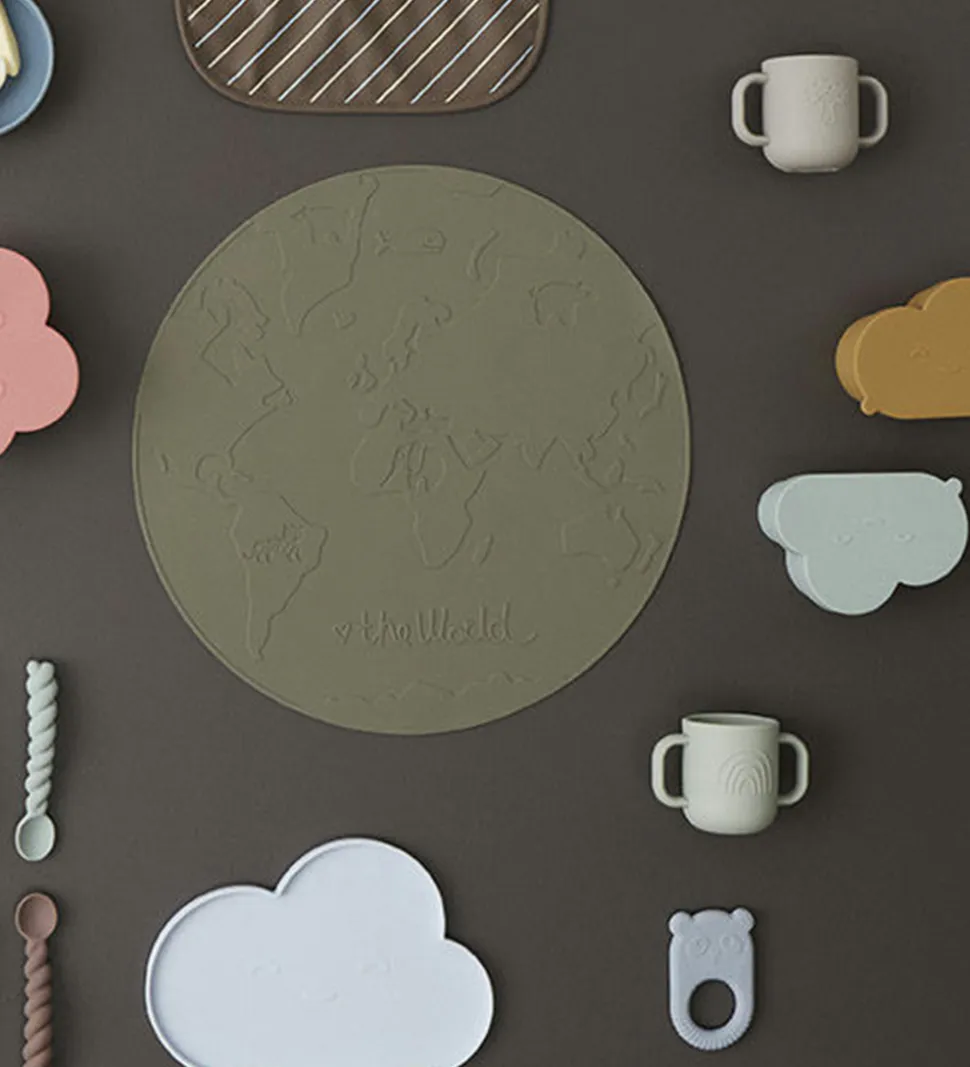 OYOY dækkeservietten er lavet af fleksibelt silikone, som er skridsikkert, når den ligger på bordet, og den går ikke i stykker, hvis den bliver tabt. De små forhøjninger fanger krummer og andet mad.